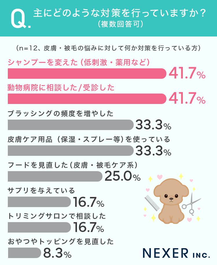次いで「ブラッシングの頻度を増やした」「皮膚ケア用品(保湿・スプレー等)を使っている」がそれぞれ33.3%、「フードを見直した(皮膚・被毛ケア系)」が25.0%と続きました。