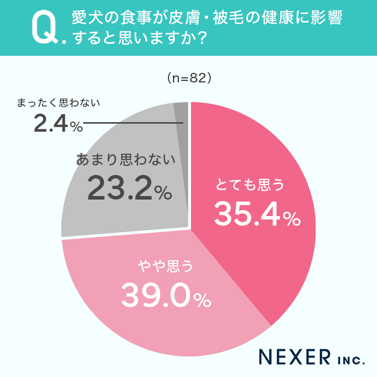 その結果「とても思う」が35.4%、「やや思う」が39.0%で、合わせて74.4%の飼い主が食事と皮膚・被毛の関連性を感じています。「あまり思わない」は23.2%、「まったく思わない」は2.4%にとどまりました。