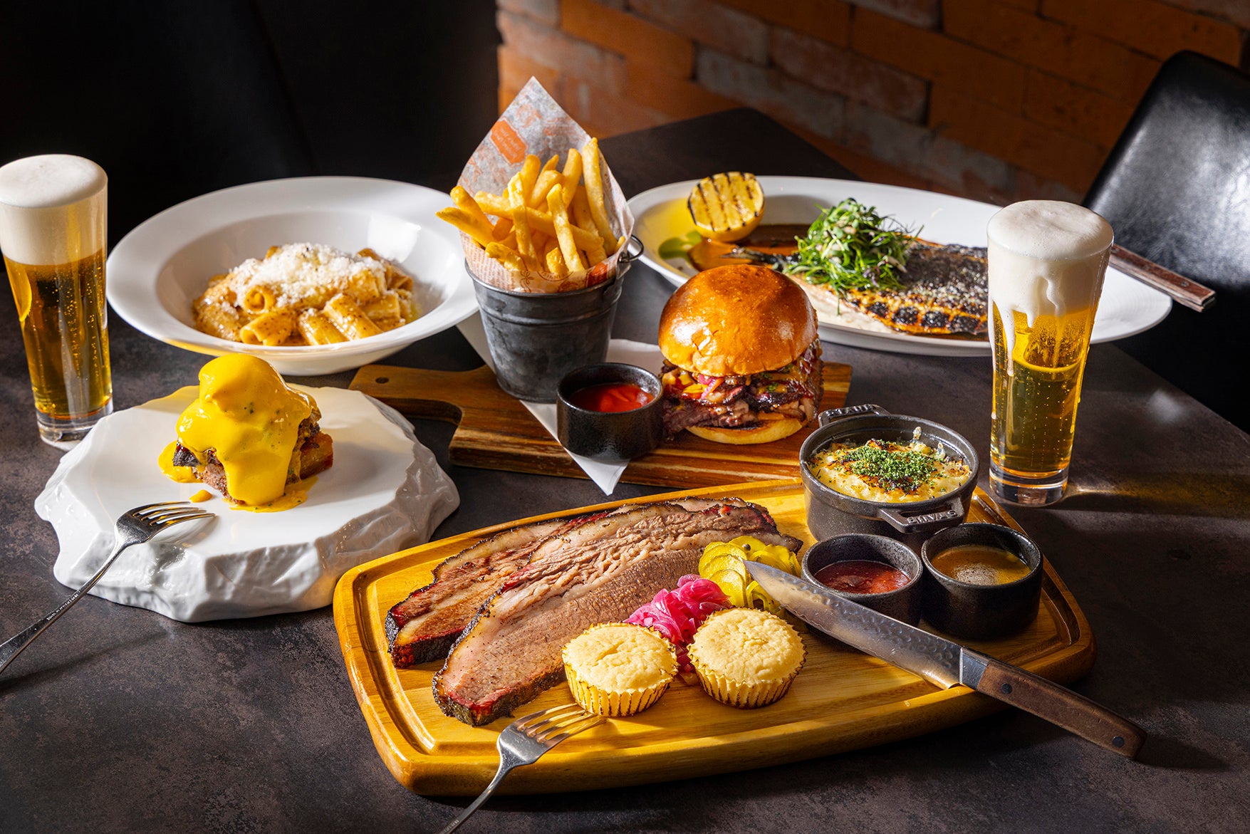 お1人様プラス¥1,600で「スモークブリスケット」、「スモークポーク」、「スモークブリスケットバーガーとフレンチフライ」などがセットになった「低温スロースモーク ハウスプラッター」、プラス¥2,200でA5和牛ランプステーキなどのアップグレードメニューも多数ご用意しています。また、週末のブランチタイムをより優雅に彩るシャンパンのフリーフロープラン(+¥6,500~)には、赤・白ワイン、ビール、ソフトドリンクもセットになります。