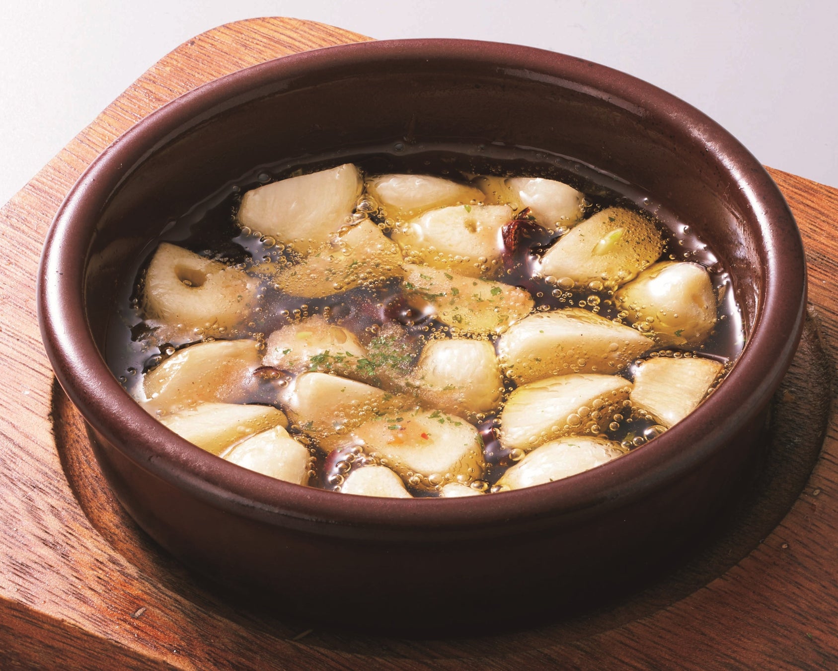 危険!にんにく、入れすぎました。ガーリックと唐辛子を効かせた熱々オイルに、旨みがじわりと溶け込む一皿。ホクホクのにんにくとともに、バゲットにオイルをたっぷり浸して楽しめる、”中毒系”アヒージョです。