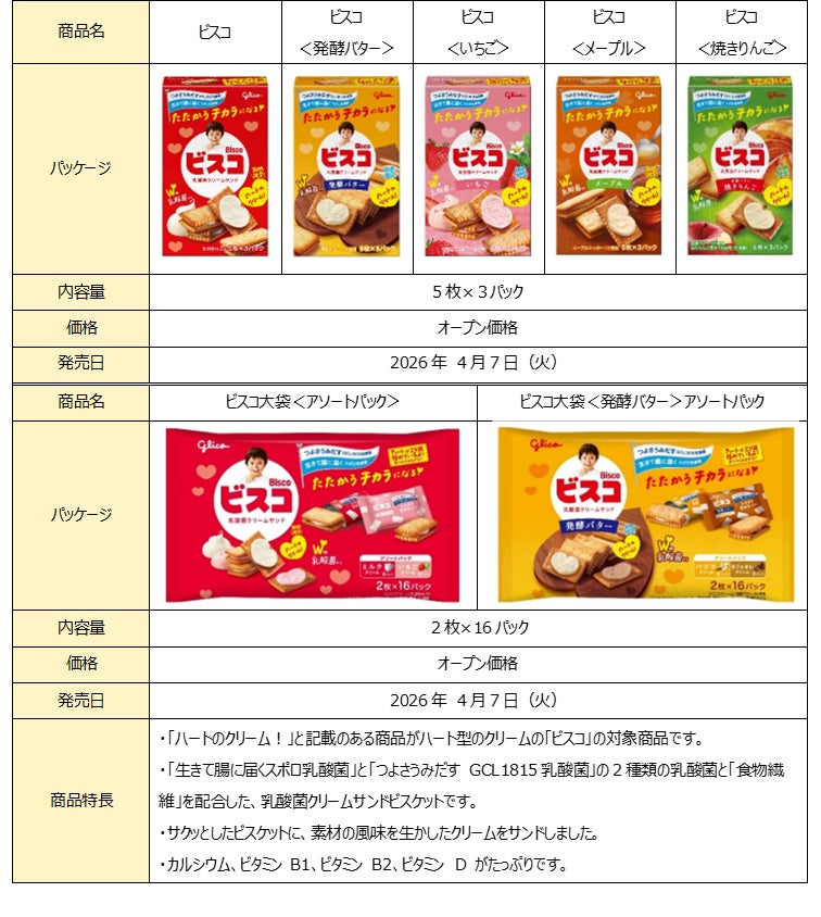 江崎グリコ株式会社は、「生きて腸に届くスポロ乳酸菌」と「つよさうみだすGCL1815乳酸菌」の2種類の乳酸菌が入った「ビスコ」から、隠れハートを探す限定パッケージになった、ハート型のクリームの「ビスコ」を、2026年4月7日(火)より全国にて期間限定で発売します※。