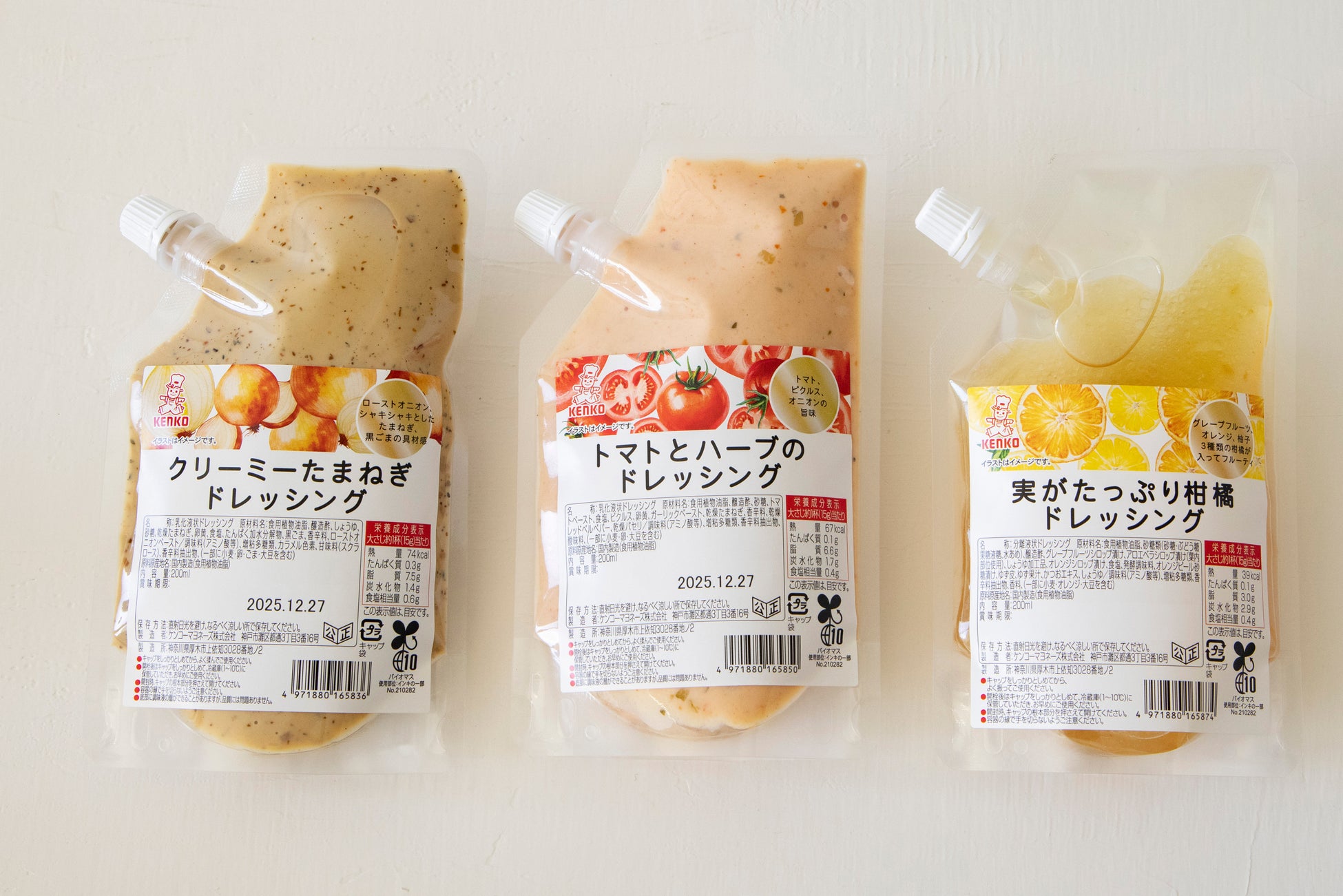 保管に場所を取らず、最後の1滴まで使い切りやすいスタンドパウチのドレッシング。『クリーミーたまねぎドレッシング』はローストオニオンをベースに、シャキシャキの玉ねぎと香ばしい黒胡麻をプラスしました。『トマトとハーブのドレッシング』はトマトの旨味を生かしたクリーミータイプ。フルーティーな『実がたっぷり柑橘ドレッシング』は、魚介のマリネやカルパッチョなどにおすすめです。