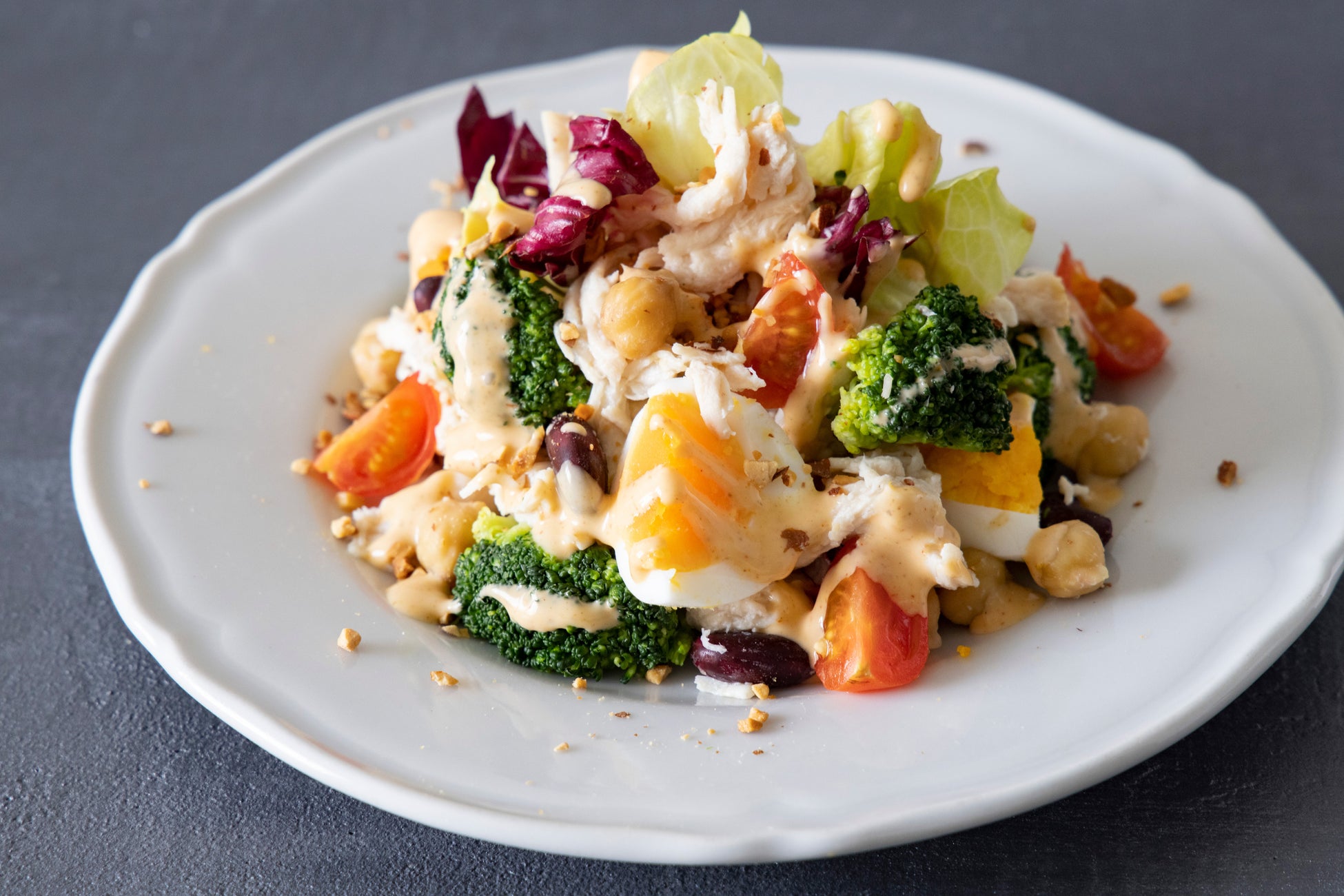 レタスとトレビスに、たんぱく質の豊富な蒸し鶏、ゆで卵、豆、ブロッコリーをバランスよく組み合わせ、仕上げにアーモンドをトッピング。カラフルな見た目も楽しく食欲をそそります。スモーキーな香りとまろやかな辛味が特長のドレッシングとともにお楽しみください。