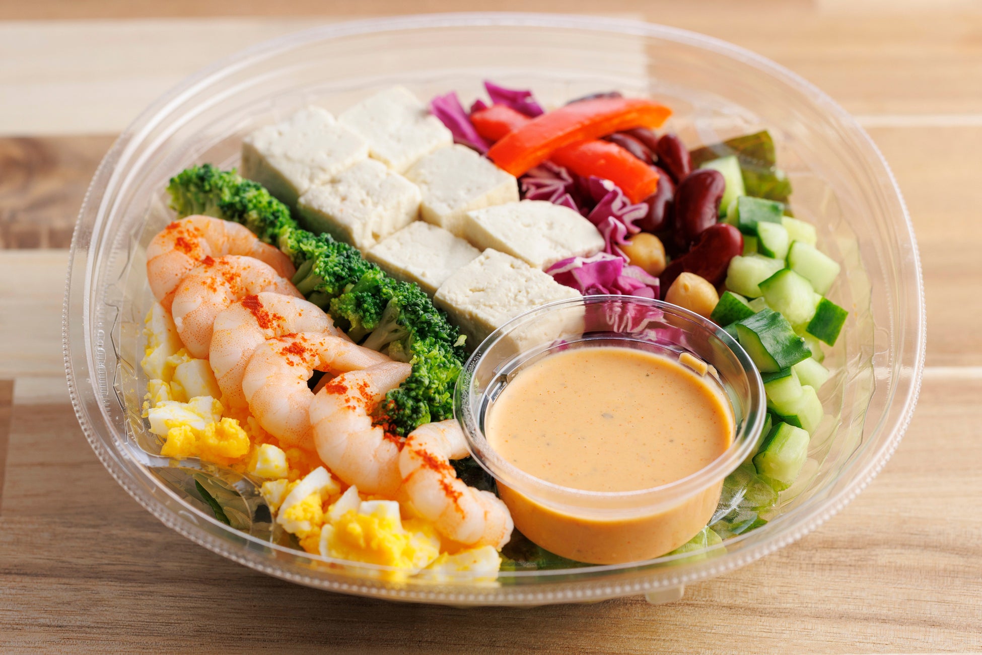 野菜とともに、海老、豆腐、豆などたんぱく質が摂れる食材が12品目入った本商品は、ファベックス「惣菜・べんとうグランプリ2026」の健康・ヘルシー部門で優秀賞を受賞しました。彩りも良く一パックで大満足のボリューム感。具だくさんのサラダによく合う、スパイシーなコブサラダドレッシングでお召し上がりください。