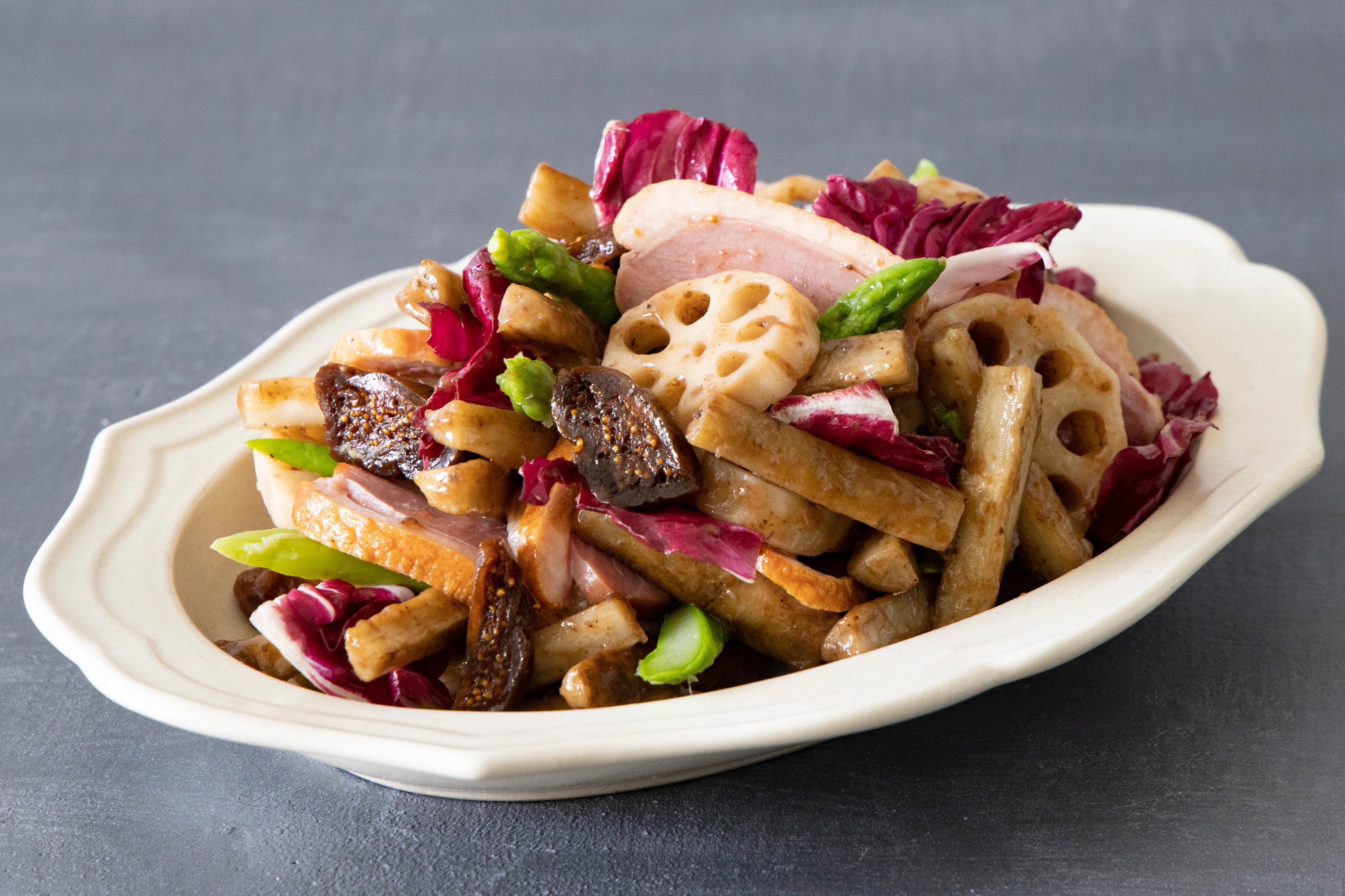 大きめに切ったごぼうとれんこんを焼き上げ、しっとり柔らかな合鴨ローストと合わせたご馳走サラダ。バルサミコ酢にすりおろしたオリーブや赤ワインを合わせたドレッシングのコクと酸味が具材の美味しさを引き立て、イタリアンな味わいを演出します。時折、顔を出すドライいちじくの甘みが軽妙なアクセントに。ワインのおつまみにどうぞ。