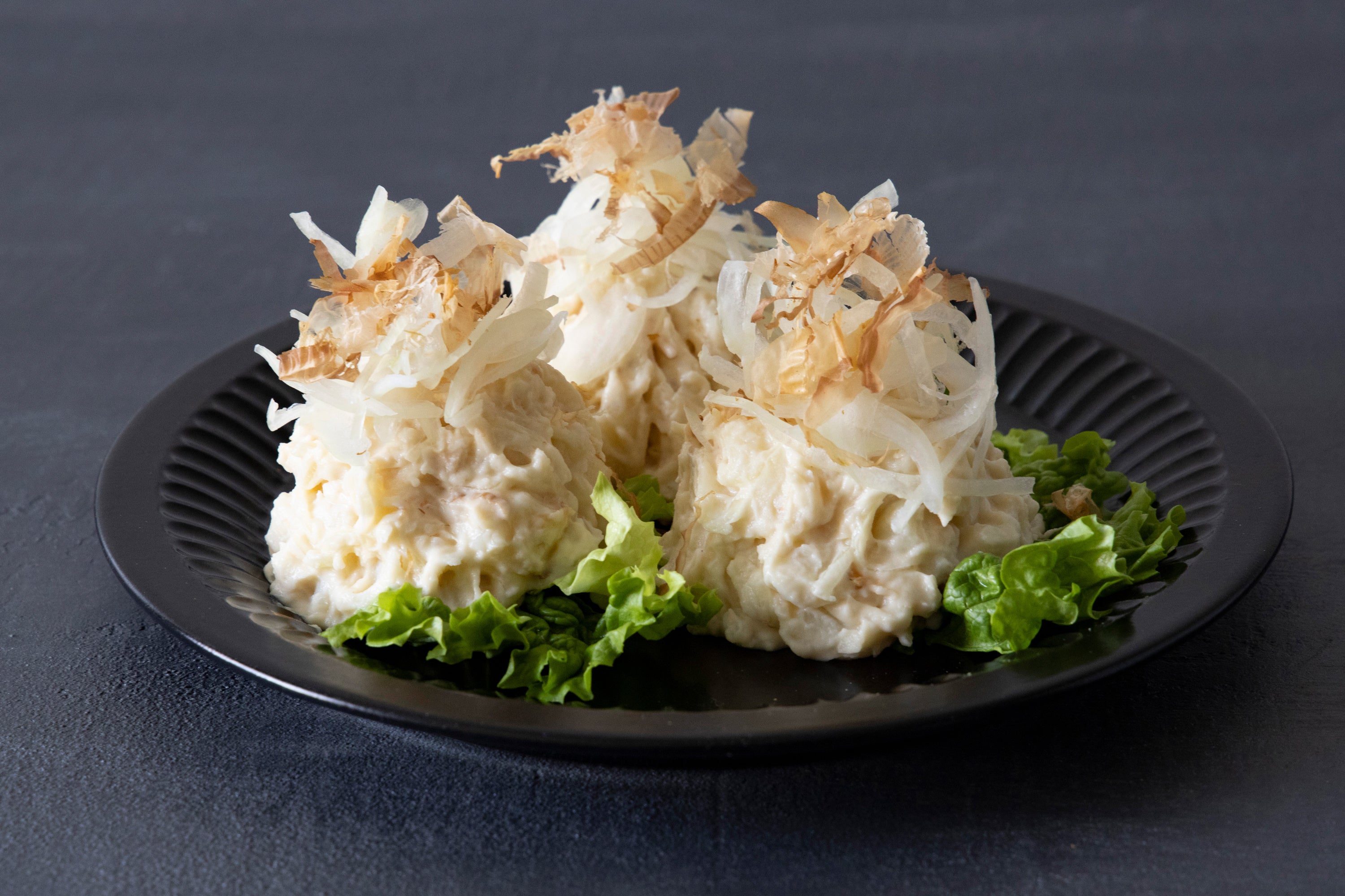 かつお節と醤油の風味が香るオリジナルソースで味付けした和風のポテトサラダに、シャキシャキとしたオニオンスライスとふわふわのかつお節をたっぷりトッピングしました。ビールはもちろん、日本酒のおつまみとしてもぴったりです。