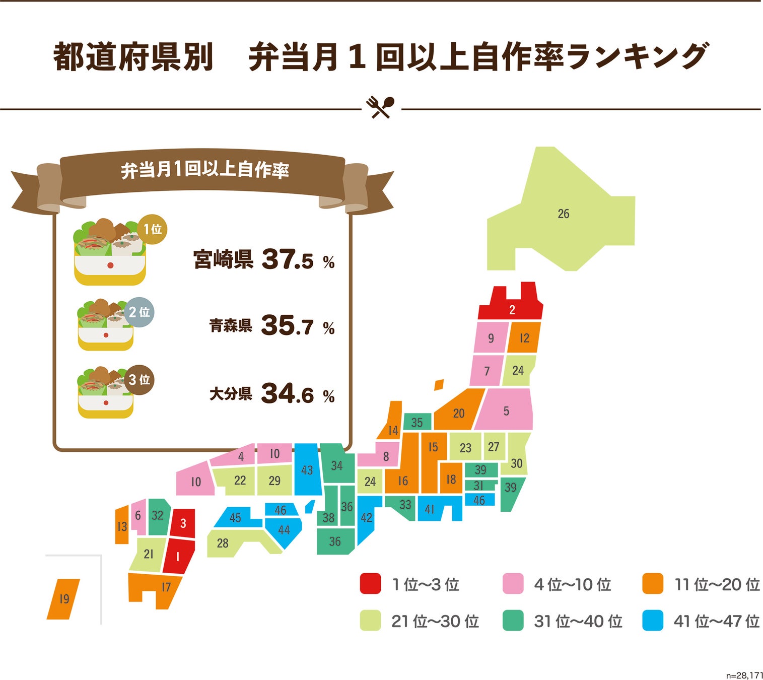 7 「お弁当を作る人の割合」は27.6%。多い順は1位「宮崎県」、2位「青森県」、3位「大分県」