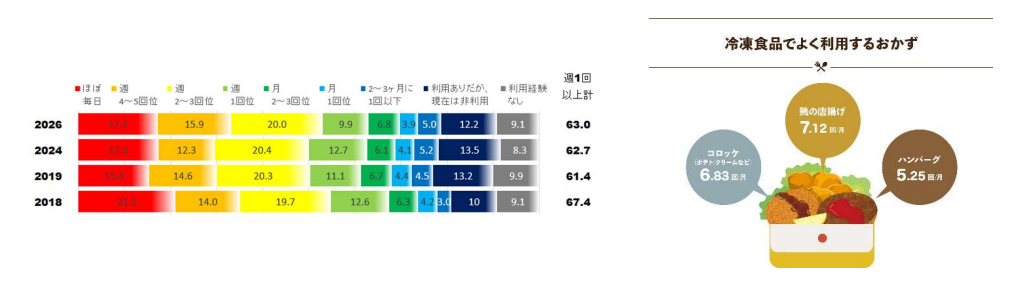 お弁当を作る人に「冷凍食品の使用頻度」を聞くと、63.0%が「週に1回以上」と回答。前回調査(2024年)から0.3ポイント増加しました。週1回以上の使用率は2018年から2019年で大幅に低下したものの、徐々に使用率の増加がみられました。
