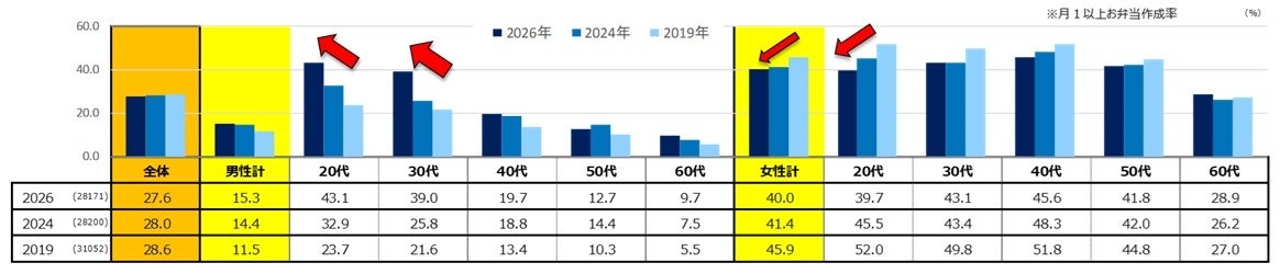 女性がお弁当を作る割合は特に20代を中心に低下している一方、若い男性がお弁当を作る傾向が増加しています。