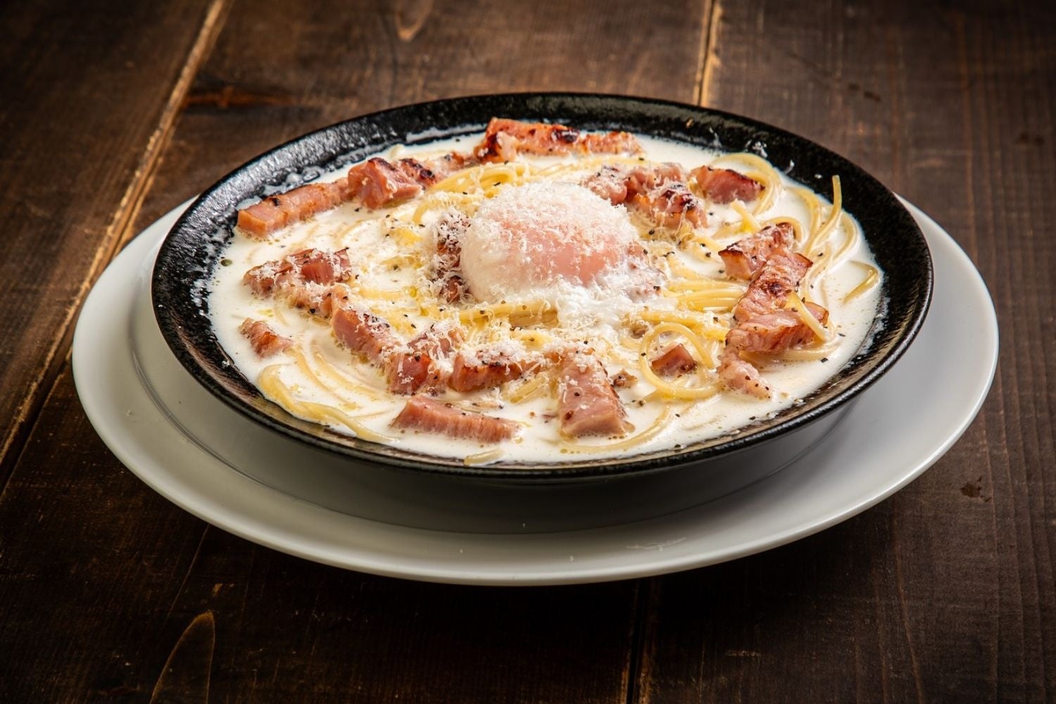 どろっと黄身がとろける半熟卵とベーコン、胡椒のアクセントが聞いたカルボナーラ風!