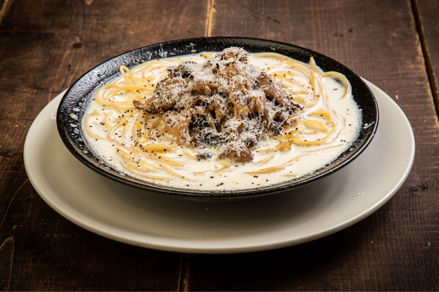 どろっと黄身がとろける半熟卵とベーコン、胡椒のアクセントが聞いたカルボナーラ風!