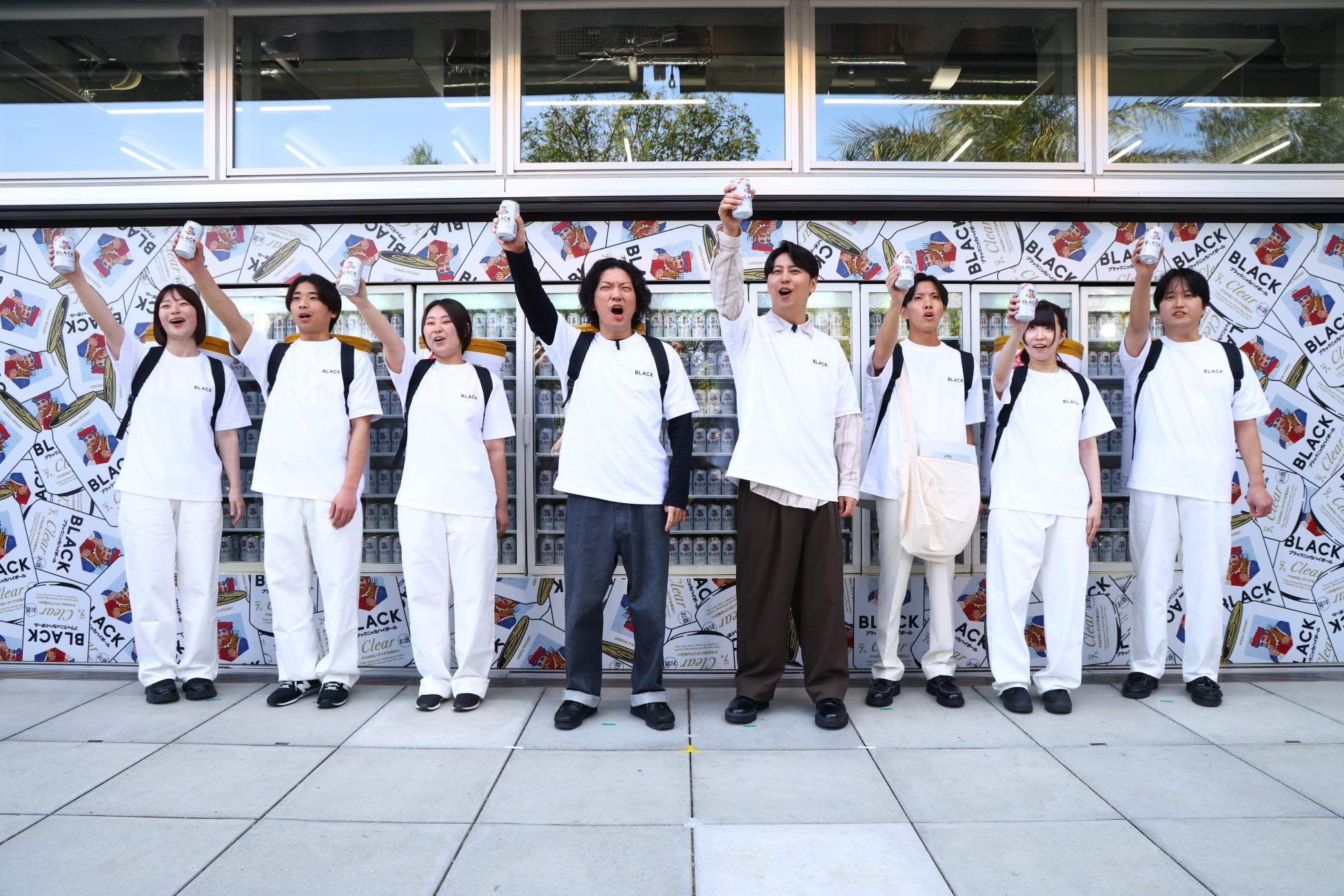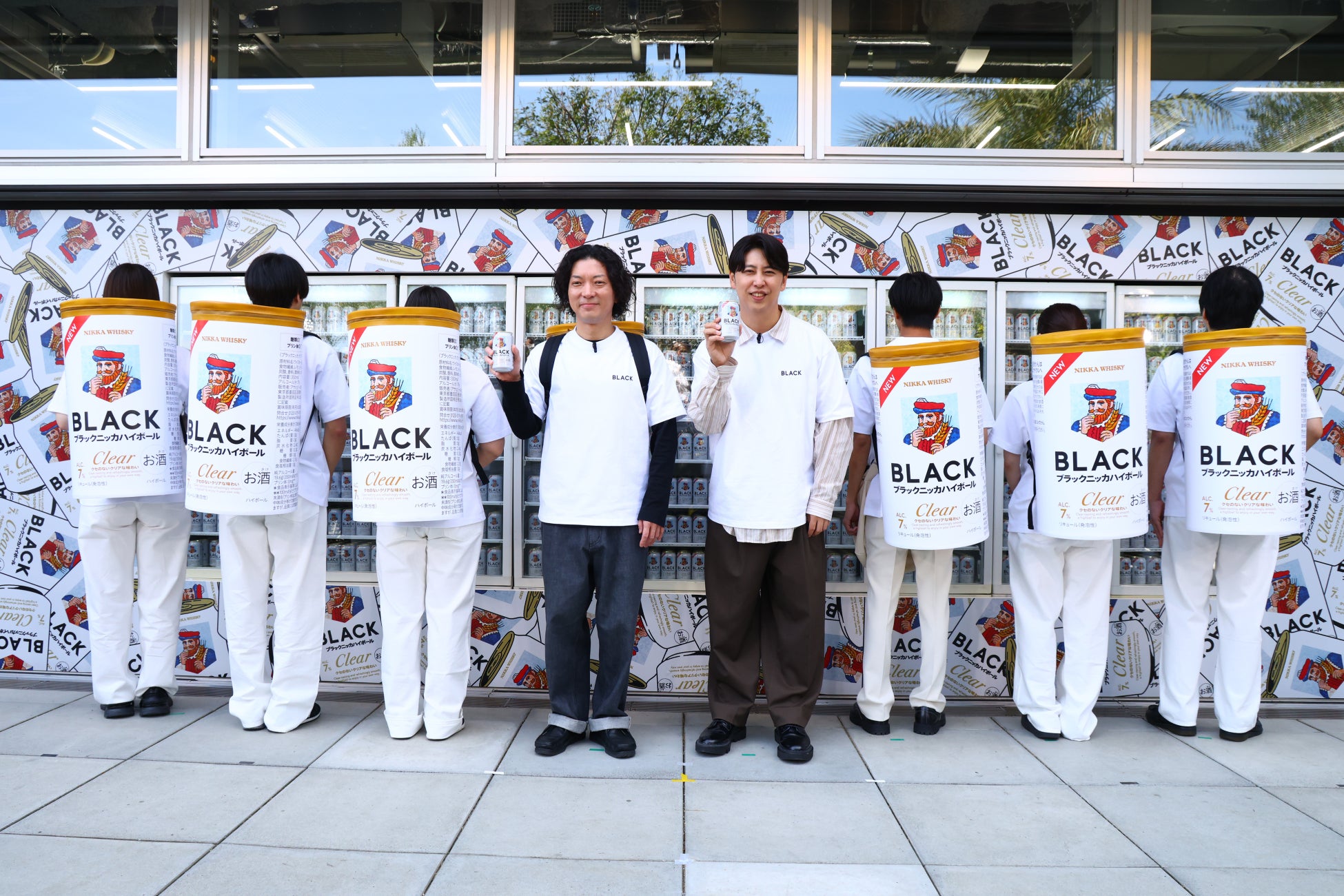 発表会の最後には、一度退場した嶋佐さんが巨大な缶ハイボールを背負って再登場。イベント期間中に渋谷・原宿界隈に出没する「ブラックニッカ隊」の隊長として、隊員たちの出発式を執り行いました。嶋佐さんは気合十分な様子で、「世界中にブラックニッカ旋風を巻き起こすために組織したブラックニッカ隊だ!」と決めポーズとともに原宿の空に大声で叫ぶと、屋敷さんが「うるさいねん!」とすかさずツッコミを入れ、会場は笑いに包まれました。「ブラックニッカ隊」は、ある合言葉でのみ反応するという特徴にちなみ、ニューヨークのお2人が「ブラックニッカ!」と呼びかけると、「ブラックニッカ隊」は大きな声で「ハイボール!」と応えながらハイボール缶を掲げ、会場を一層盛り上げました。
