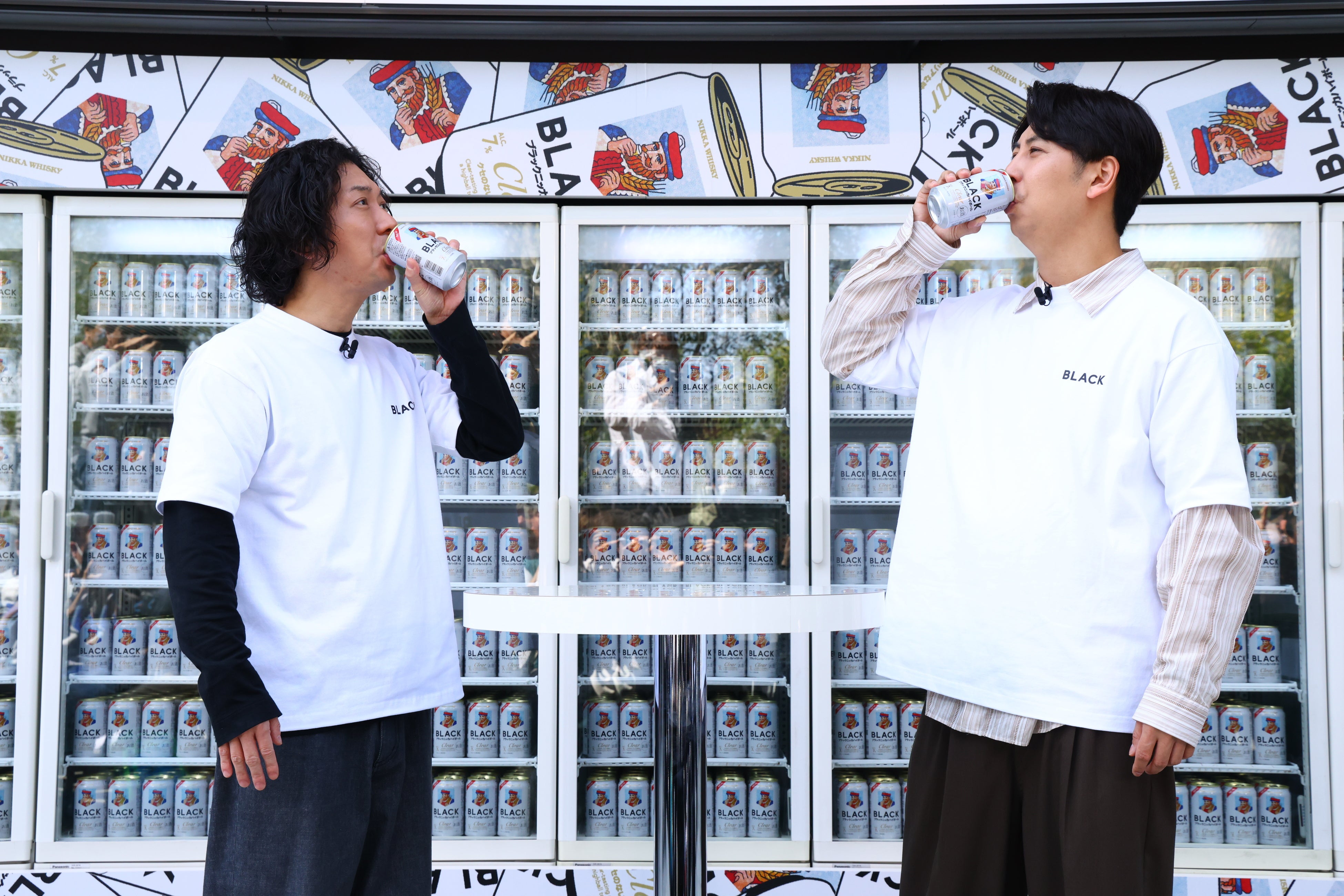 その後、お客様第一号として、会場内の大型冷蔵庫から『ブラックニッカ クリアハイボール』を取り出し、試飲を行いました。2人とも飲みやすさに驚き、「クセがなくて飲みやすい!」「スッキリしているので、これから暖かくなる季節にいいですね!」と感想を語りました。