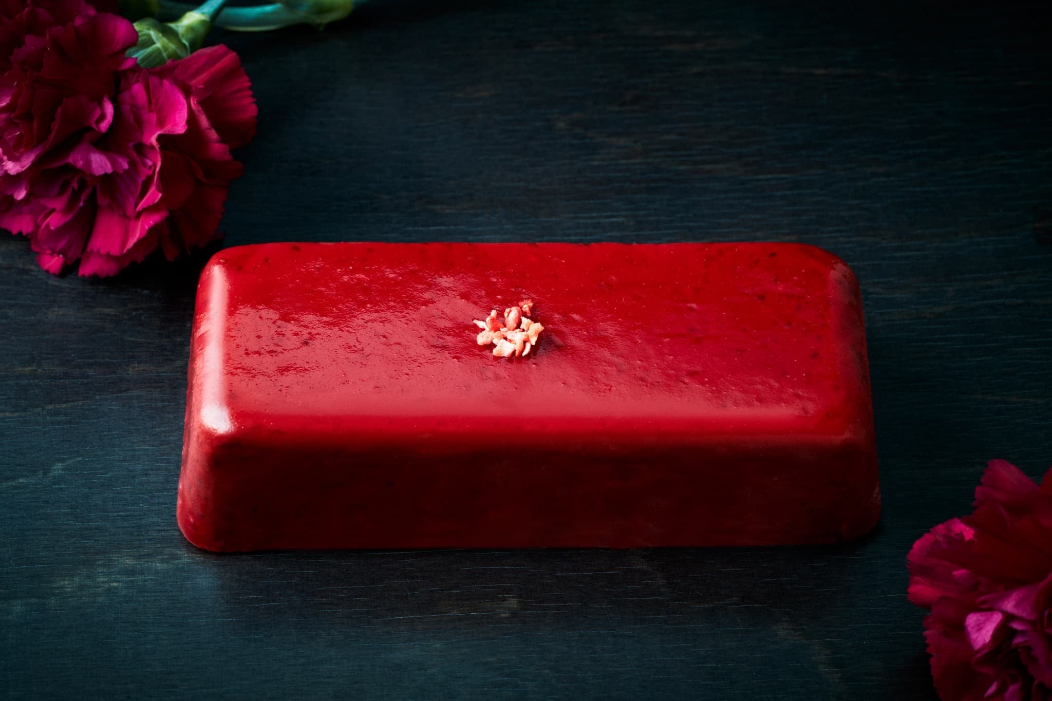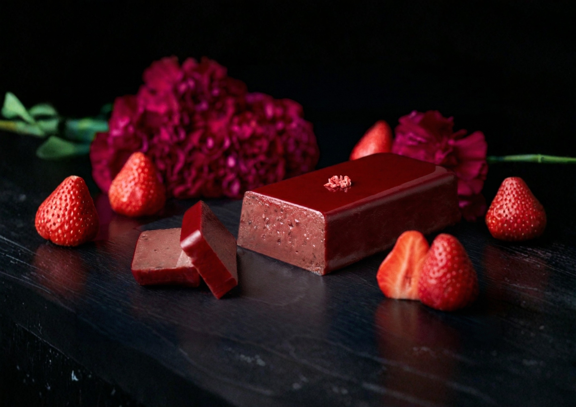 ベリー由来の自然な赤色のグラサージュが華やかさを演出し、ひと口で甘酸っぱいいちごの風味と濃厚なショコラの口どけが広がります。