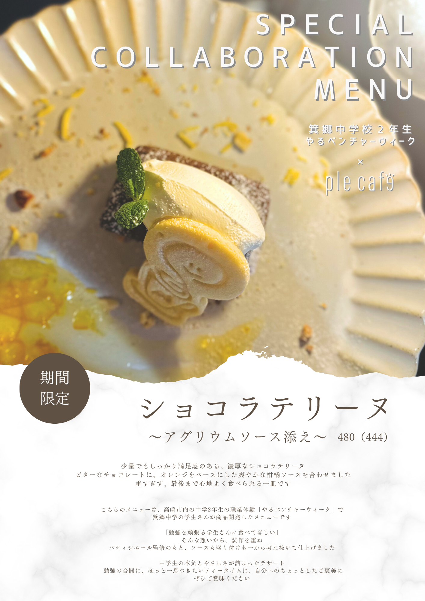 この仮説をもとに開発されたのが「ショコラテリーヌ ~アグリウムソース添え~(税込480円)」。濃厚なショコラテリーヌに、オレンジをベースとした爽やかな柑橘ソースを合わせ、重すぎず最後まで楽しめる一皿に仕上げました。