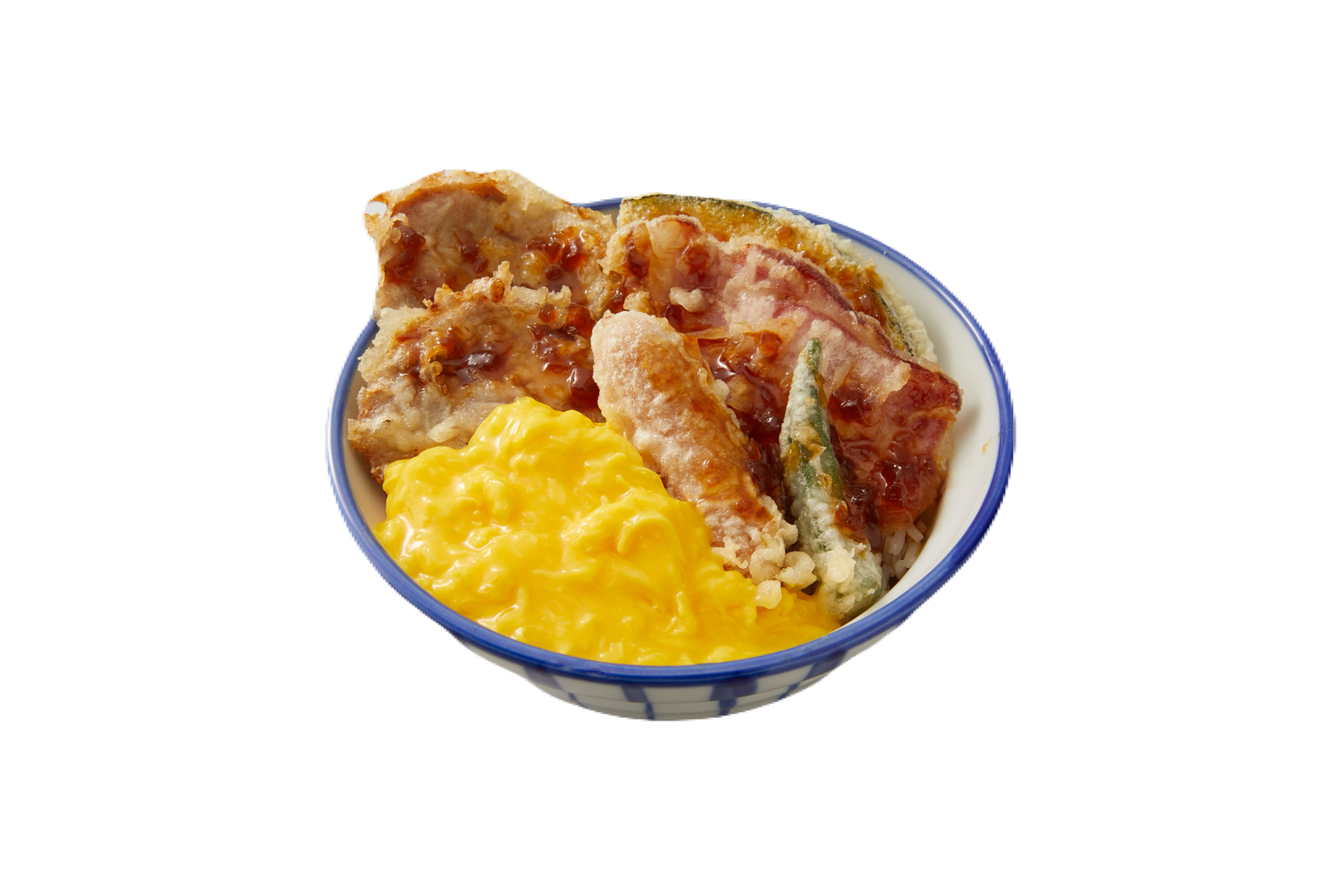 ジューシーなチャーシュー・ベーコン・ソーセージの天ぷら3種に、濃厚なとろっとたまごがからみ合います。いつもの天丼たれとはひと味違ったおいしさが楽しめる「やみつきオニオンソース」をかけてお楽しみください。