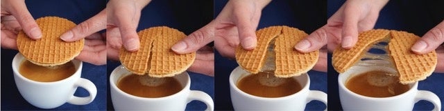 そのままかじるのもよし、おすすめの食べ方は、温かいコーヒーや紅茶を注いだカップの上にワッフルを置き、湯気で少ししっとりさせて食べる方法。中のシロップがじんわり溶けて、違った食感が楽しめます。