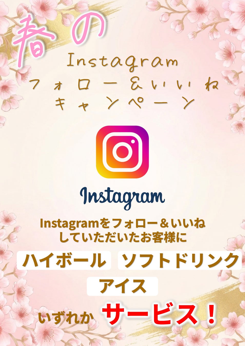 フォロー&いいね でハイボールorソフトドリンクorアイス をサービス!