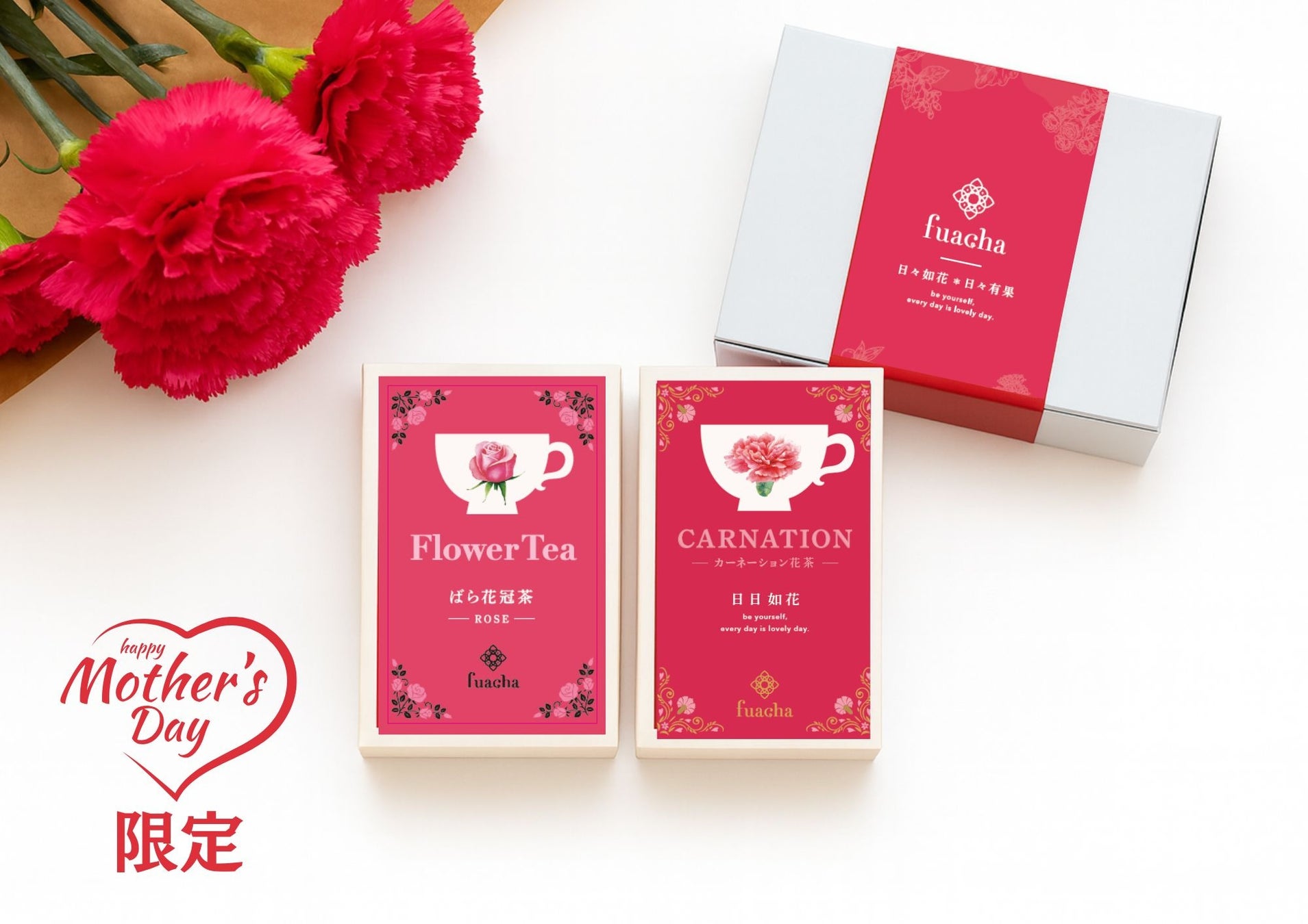 母の日の象徴「カーネーション」を花茶として贈るfuacha母の日限定ギフト。