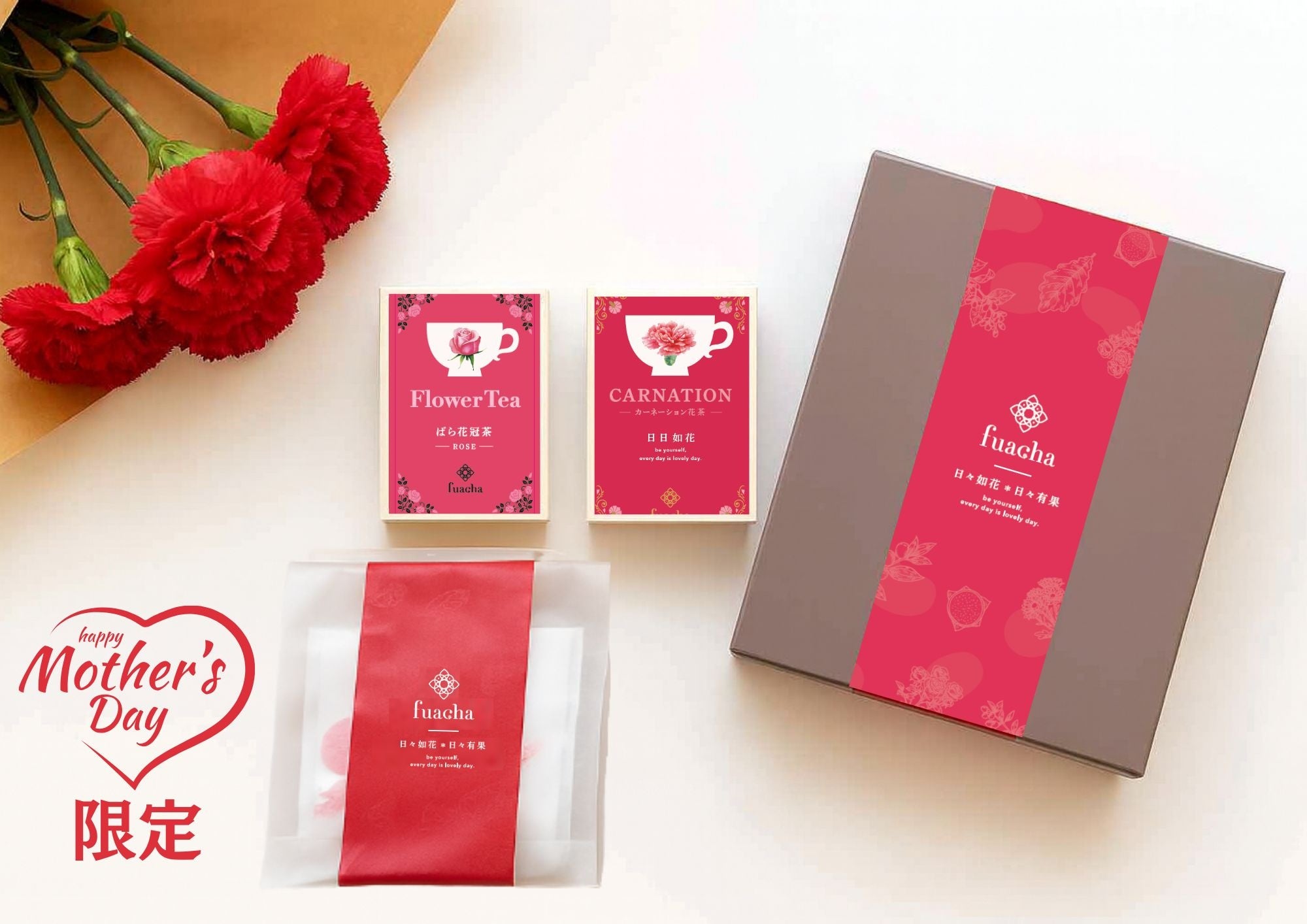 母の日の象徴「カーネーション」を花茶として贈るfuacha母の日限定ギフト。