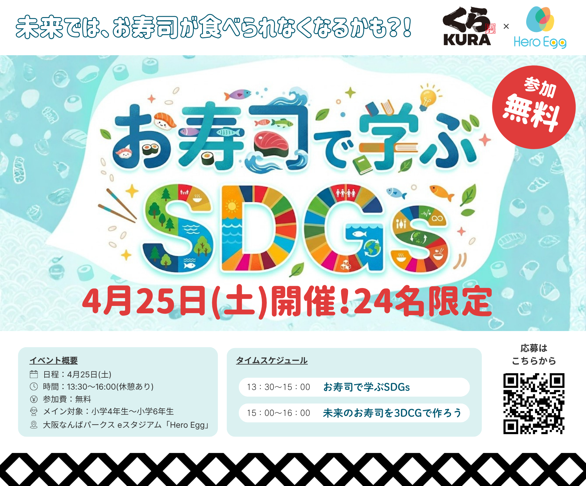株式会社Meta Heroes(本社所在地:大阪府大阪市、代表取締役:松石和俊、以下「当社」)は、当社が運営するDX教育施設「Hero Egg(ヒーローエッグ)」において、回転寿司チェーン「くら寿司」を展開しているくら寿司株式会社(本社所在地:大阪府堺市、代表取締役社長:田中邦彦、以下「くら寿司」)とのコラボレーションによる体験型学習イベント「お寿司で学ぶSDGs」を2026年4月25日(土)に開催いたします。
