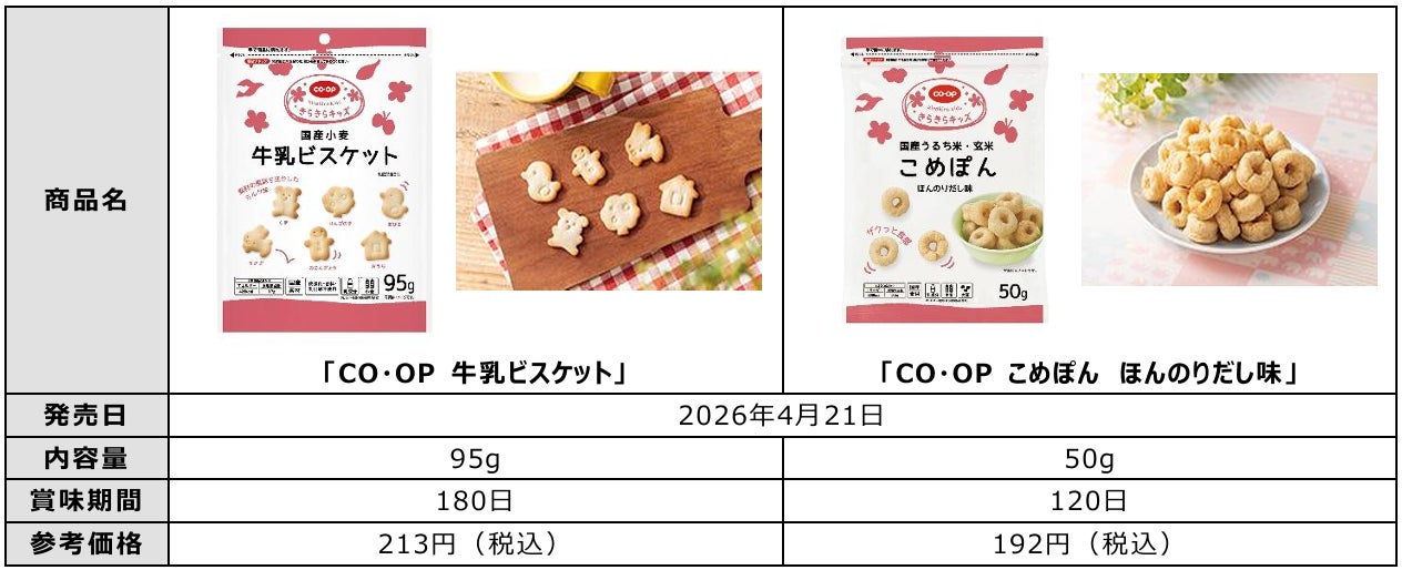 日本生活協同組合連合会(略称:日本生協連、代表理事会長:新井ちとせ)は、子育て世帯を応援する商品拡充の一環として、3~6歳児向け「きらきらキッズ」から「CO・OP 牛乳ビスケット」、「CO・OP こめぽん ほんのりだし味」の2商品を2026年4月21日より順次発売します。