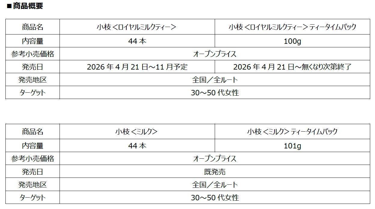 森永製菓株式会社(東京都港区芝浦、代表取締役社長COO・森 信也)は、発売55周年を迎えるロングセラーチョコレート「小枝」から、紅茶が上品に香り立つ味わいが楽しめる「小枝<ロイヤルミルクティー>」を4月21日(火)より期間限定で発売いたします。