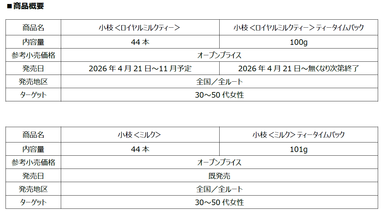 森永製菓株式会社(東京都港区芝浦、代表取締役社長COO・森 信也)は、発売55周年を迎えるロングセラーチョコレート「小枝」から、紅茶が上品に香り立つ味わいが楽しめる「小枝<ロイヤルミルクティー>」を4月21日(火)より期間限定で発売いたします。