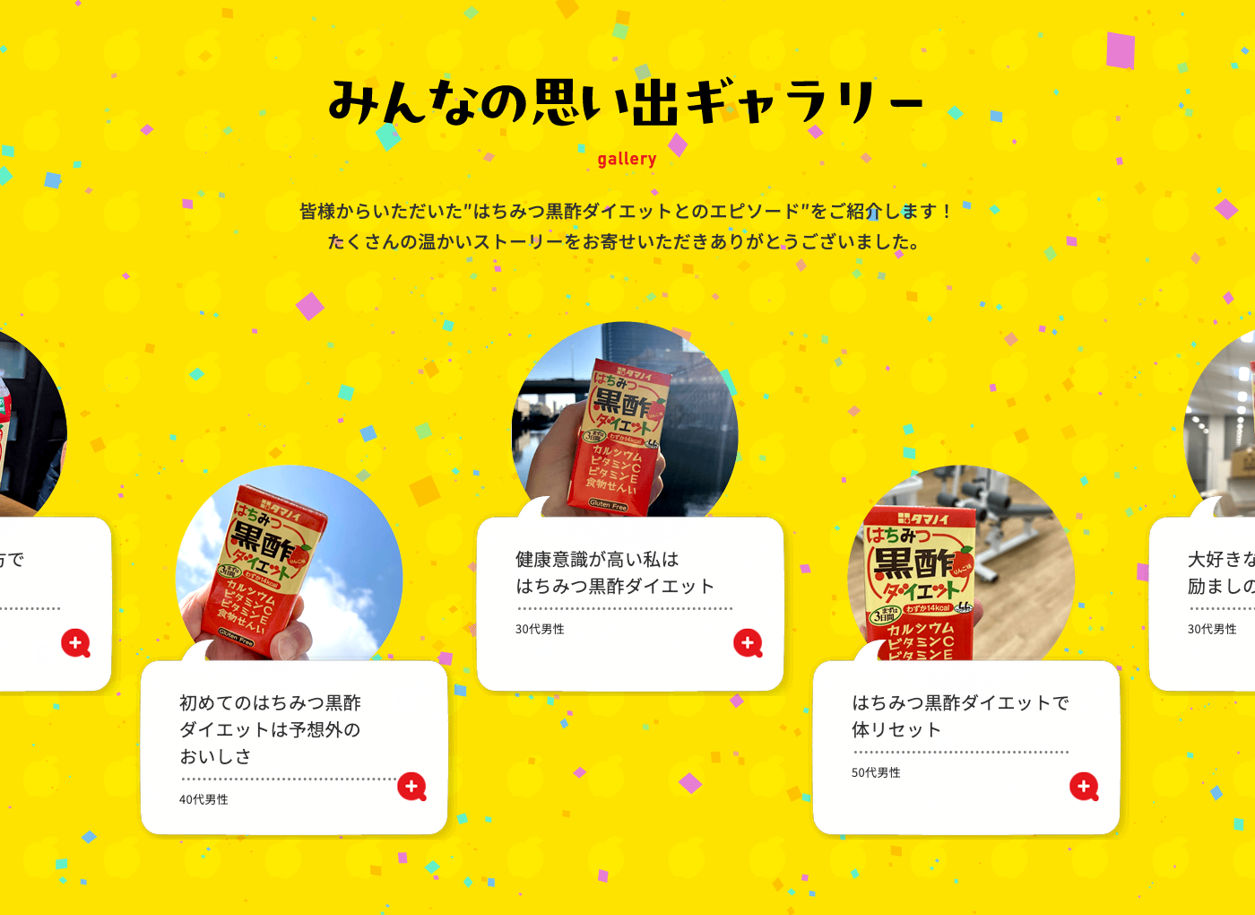 周年特設サイト内の「みんなの思い出ギャラリー」では、“はちみつ黒酢ダイエット”にまつわる、皆様から寄せられた心温まるエピソードをご紹介しています。日々の健康習慣として取り入れている方の声や、ご家族との思い出、大切な節目に寄り添ったストーリーなど、一つひとつに商品の歩みとお客様との繋がりがあります。本ギャラリーを通じて、これまでの感謝の気持ちと共に、これからも多くの方の暮らしに寄り添い続けていきたいという想いをお届けします。