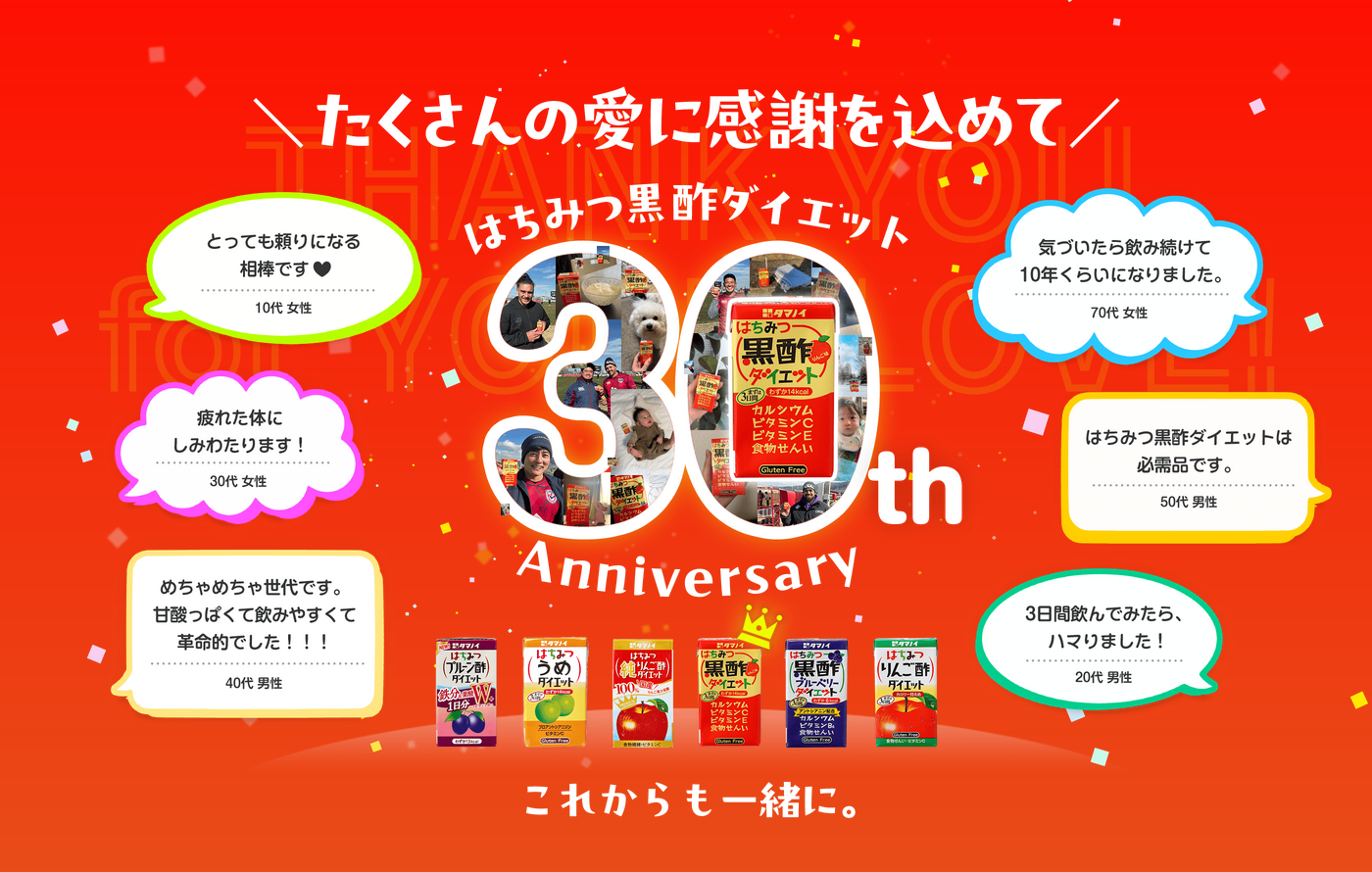 タマノイ酢株式会社(本社:大阪府堺市 代表取締役社長:播野 貴也、以下当社)は、2026年4月1日(水)に、「はちみつ黒酢ダイエット」発売30周年を記念し、周年特設サイトをオープンしました。長年にわたるご愛顧への感謝を伝えるために、各種コンテンツを提供。新商品発売やキャンペーン実施を通して、「はちみつ黒酢ダイエット」発売30周年を盛り上げて参ります。