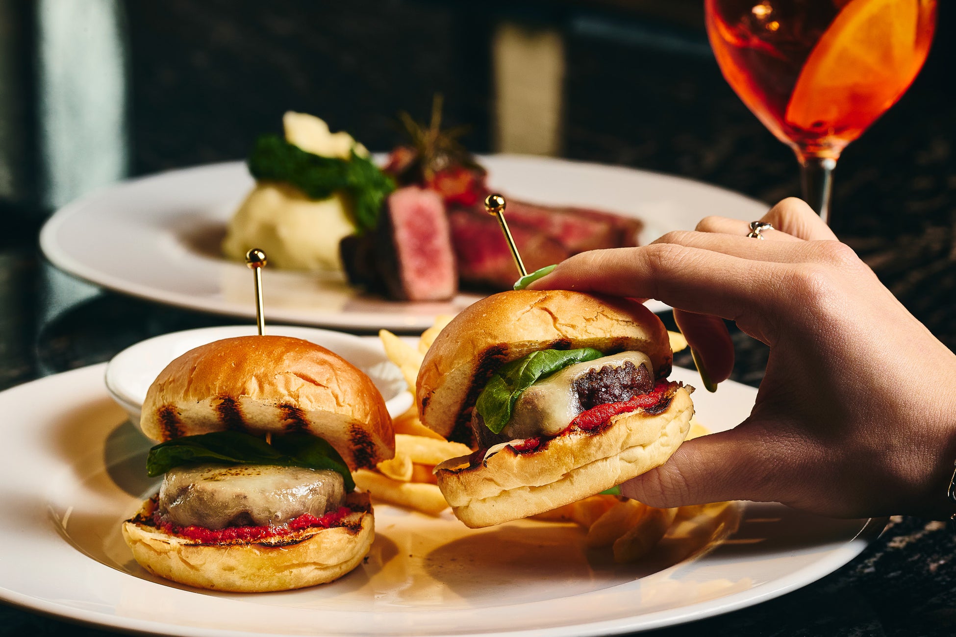 ランチメニューでも人気のハンバーガーを、ハッピーアワー限定でミニサイズにアレンジ。ジューシーなUSDA PRIMEビーフの旨みを、軽やかに楽しめる2ピースセットでご用意しました。