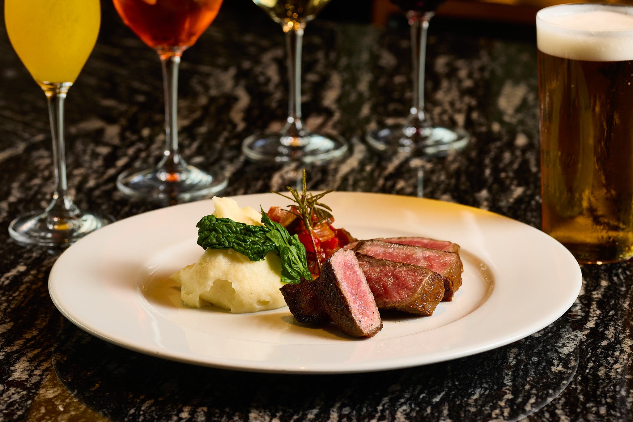 肉本来の旨みを引き出すように焼き上げたUSDA PRIMEビーフを、しっとりとしたタリアータでご提供。なめらかなマッシュポテトと、野菜の旨みが凝縮したカポナータを添えた、満足感のある一皿です。