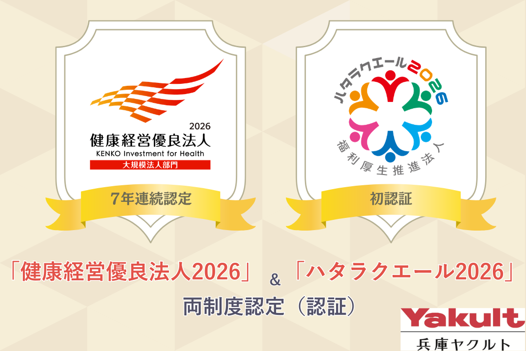 兵庫ヤクルト販売株式会社(本社:神戸市西区 代表取締役:阿部 恭大)は、7年連続となる「健康経営優良法人2026(大規模法人部門)」の認定に加え、本年度より、福利厚生の充実に取り組む法人を表彰・認証する「ハタラクエール2026 福利厚生推進法人」において初めて認証されました。