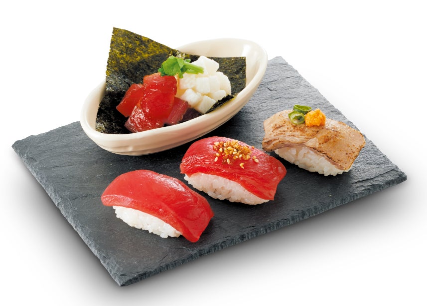 天然めばちまぐろの「赤身にぎり」の他、丁寧に炙ったまぐろに薬味を添えた「炙りにぎり」、ガーリックの風味とザクザクとした食感がたまらない「ザクザク醤油にぎり」、店仕込みの漬けまぐろを長芋と一緒にお召し上がりいただく「まぐろと長芋の手巻き寿司」の4種類のお寿司をご用意。こだわりの天然まぐろのお寿司を心ゆくまでお楽しみください!