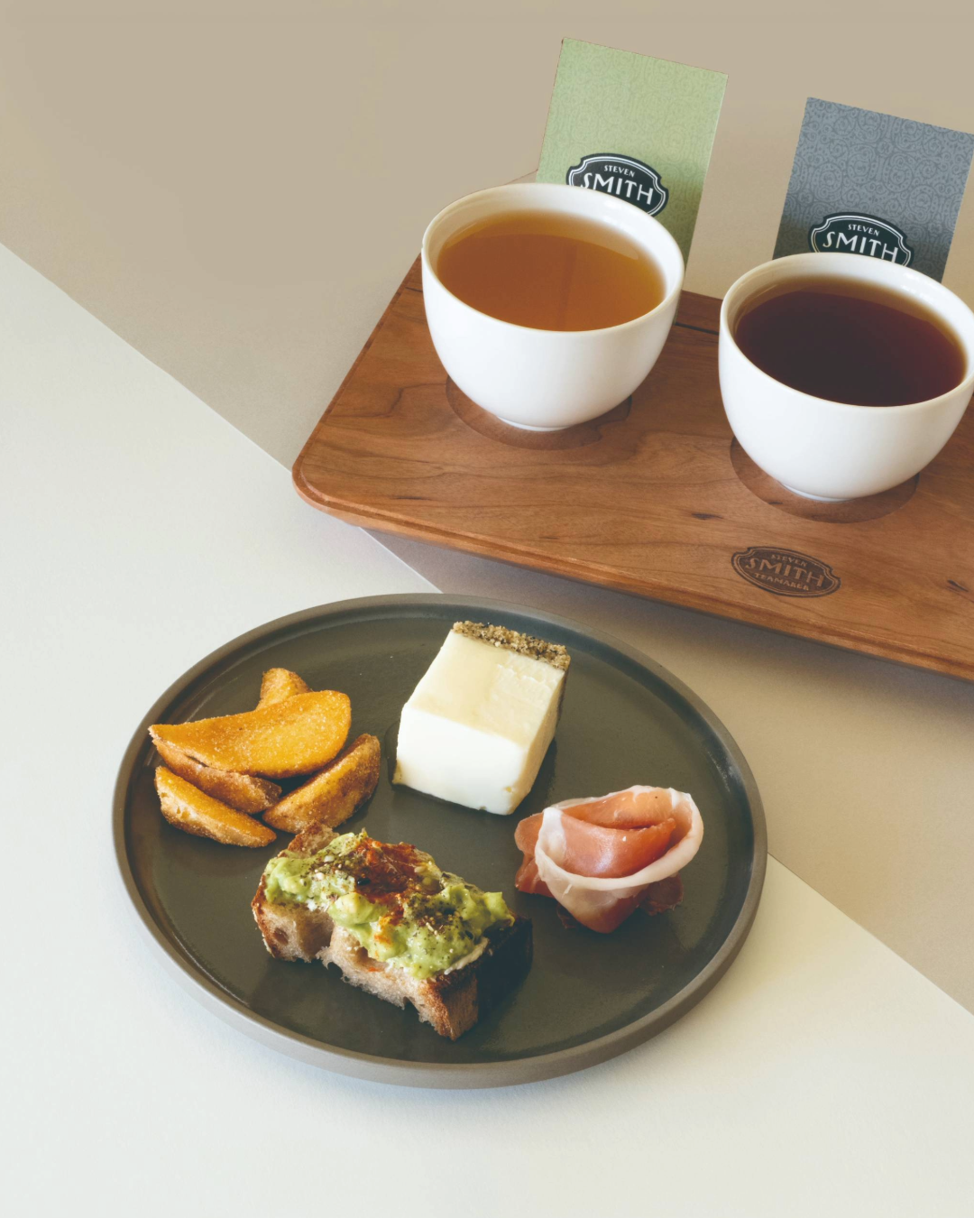 チーズケーキ、アボカドトースト、ハモンセラーノ、アンドザフリットを一皿に。店舗で提供しているメニューをティーと同じ感覚で少しずつ味わいながら、3種のティーとの相性をお楽しみいただけます。フライトとテイスティングプレートを合わせれば、スミス・ティーメーカー流のミニアフタヌーンティーのできあがり。少しずつ、いろいろと。そんな贅沢な春の午後を。