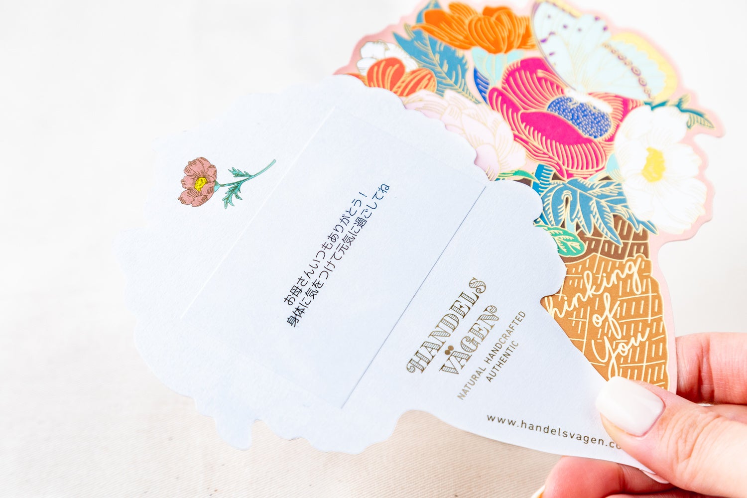 カードのデザインは、ハンデルスベーゲンの公式サイトやシーズナルキャンペーンのアートディレクションを担当する増子勇作さんによるもの。「Thinking of you」の文字が入ったアイスクリームコーンに、カーネーションをはじめ、様々な花があしらわれています。花束の形に切り抜かれたダイカット仕様に金の箔押しも施され、華やかさもプラスされた素敵な仕上がりになりました。