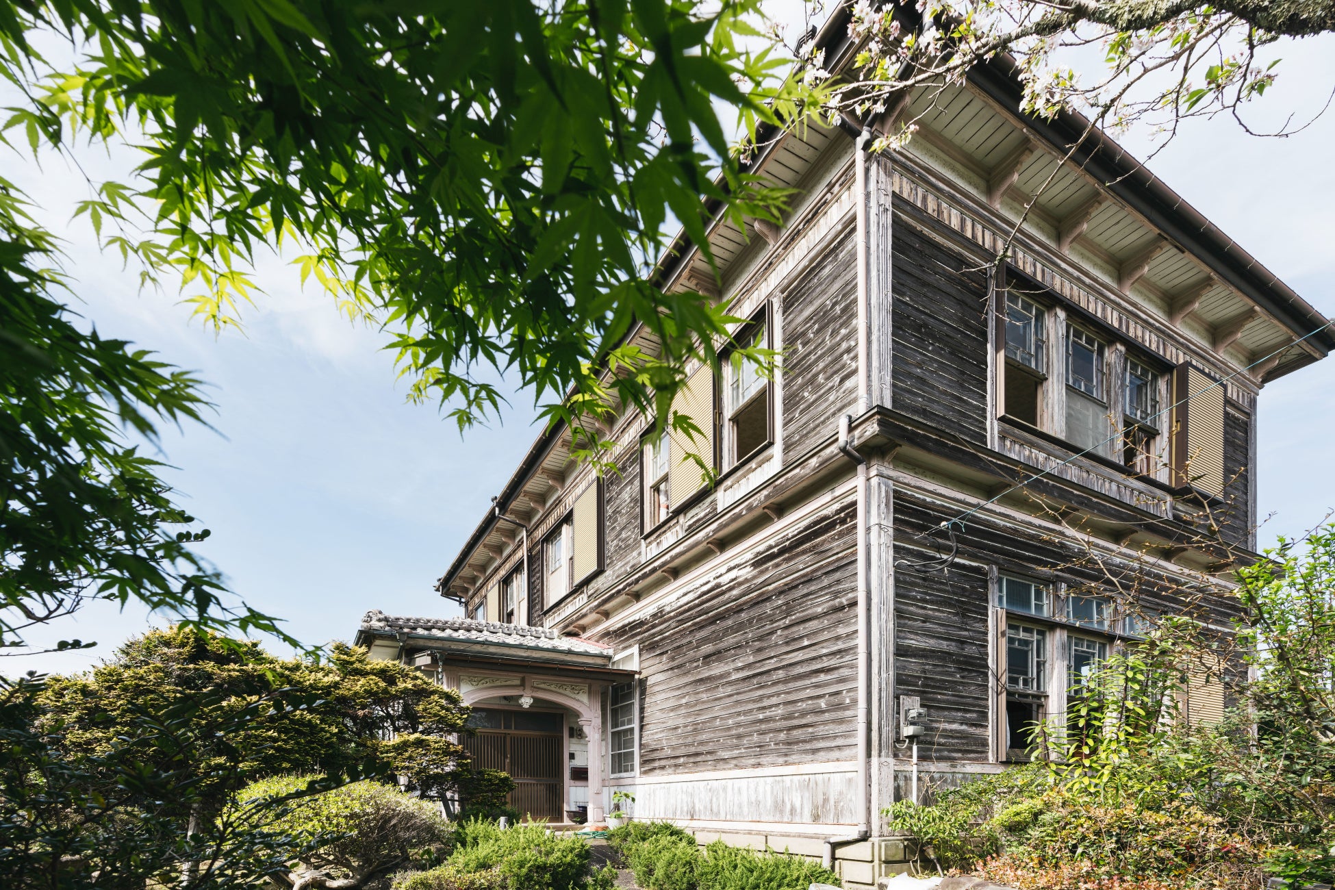 「旧梅村邸」は、漆喰装飾や高天井、分銅吊りの格子状の上げ下げ窓など、和洋折衷の美しい意匠を残す歴史的建造物です。