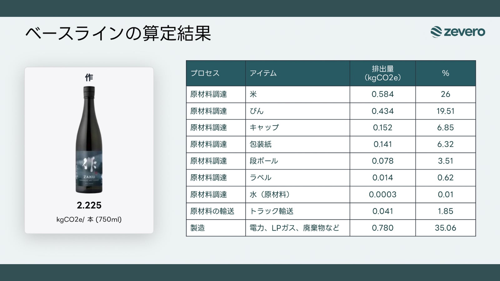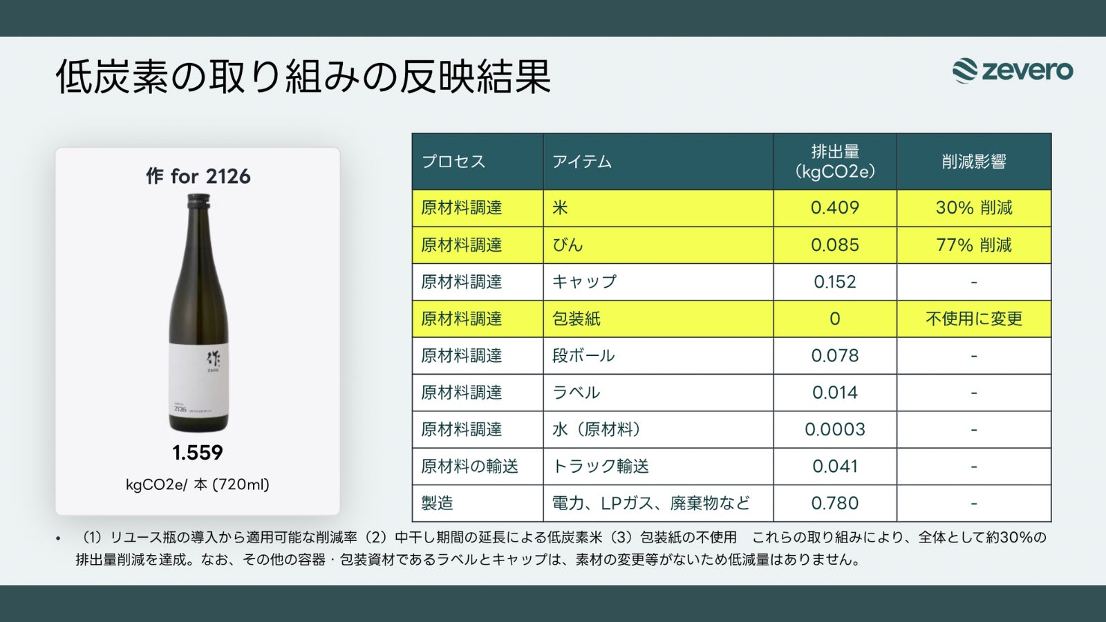さらに、脱炭素測定の第三者機関「Zevero」による測定を行い、酒造り全体で排出される温室効果ガスをCO₂換算で可視化。