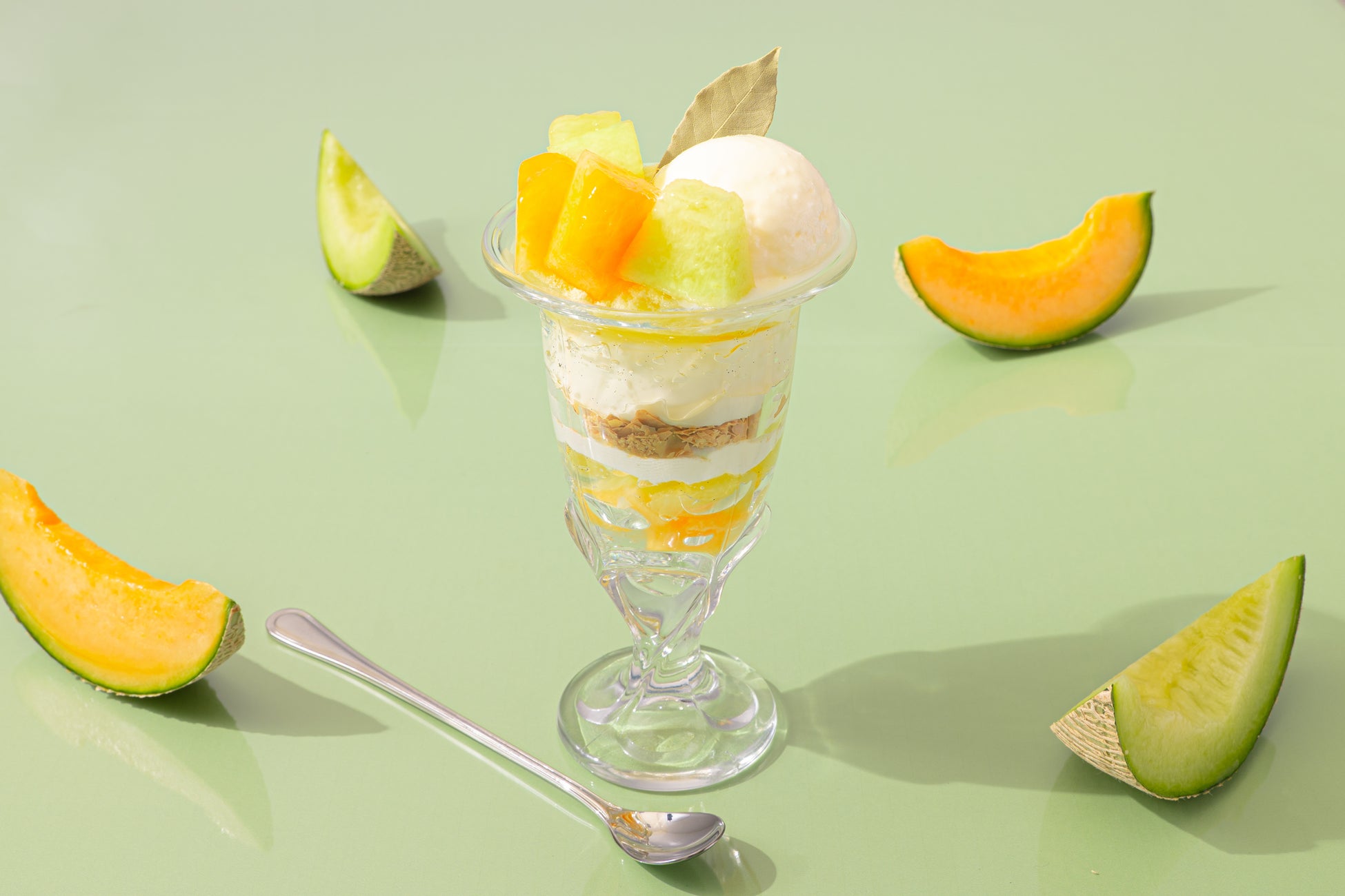 ね、さまざまな食感と味わいの層をお楽しみいただけます。さらに、カットした赤肉メロン