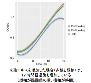 その結果、米麹エキスを添加した条件では、エキスの濃度に関わらず12時間経過後も菌が同程度の割合で増殖し続け、蒸留水を添加した条件に比べて培地の菌量は約1.2倍に増えました。