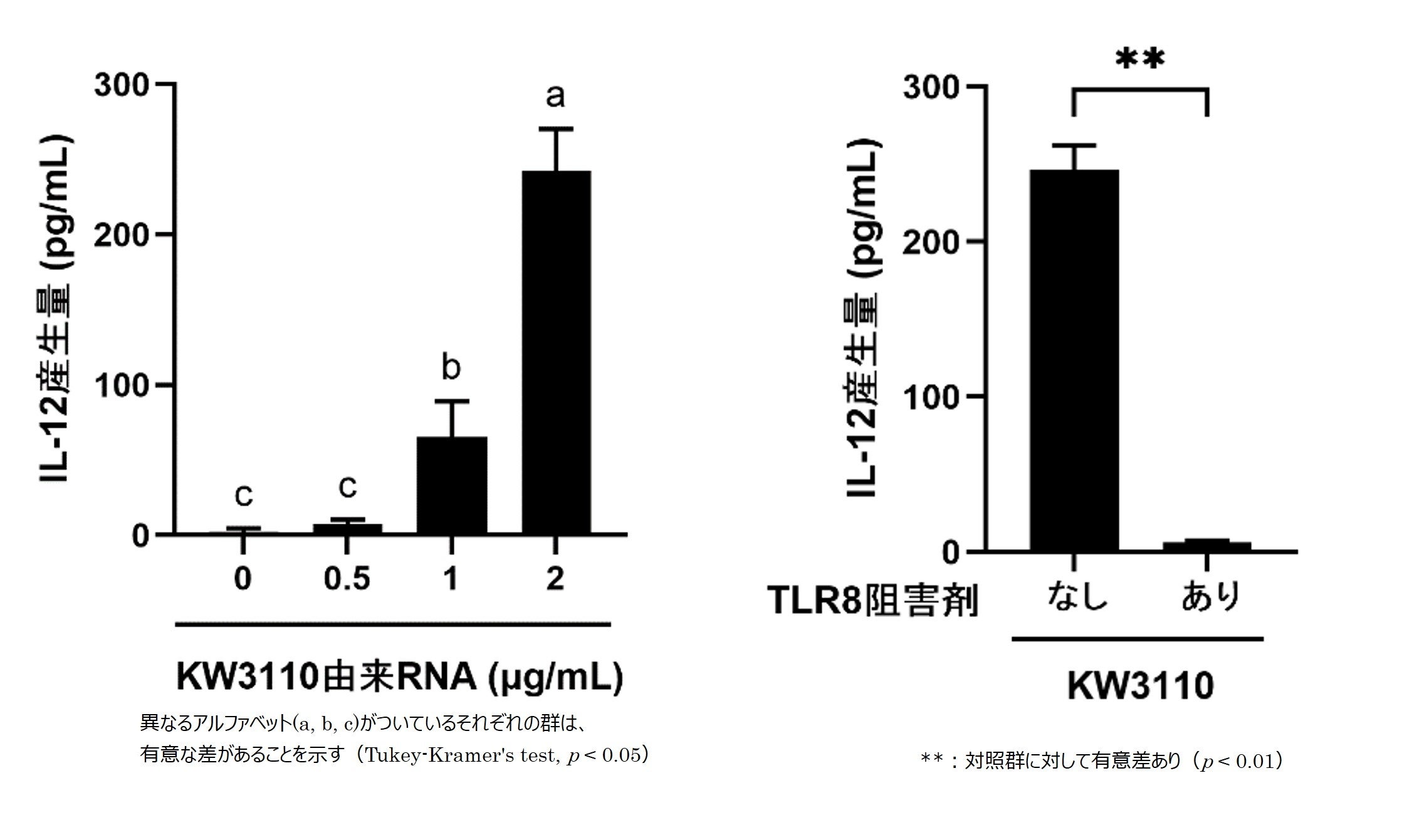 樹状細胞において、乳酸菌L. パラカゼイ KW3110由来のRNAはIL-12産生を誘導することを確認しました(図3左図)。一方で、1本鎖RNAを認識するTLR8を選択的に阻害すると、乳酸菌L. パラカゼイ KW3110によるIL-12産生誘導がみられなくなったことから、RNAが樹状細胞内のTLR8を介して認識されることで、IL‑12の産生が促進されることを確認しました(図3右図)。