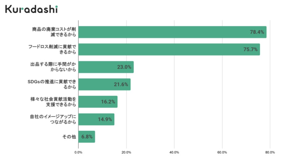 「商品の廃棄コストが削減できるから」と回答した事業者が最も多く、78.4%でした。2024年調査時点からは、+18.2ポイント増加しており、昨今の原材料の高騰や資材の高騰によるコスト増から、廃棄コスト削減への意識が高まっているように見えます。