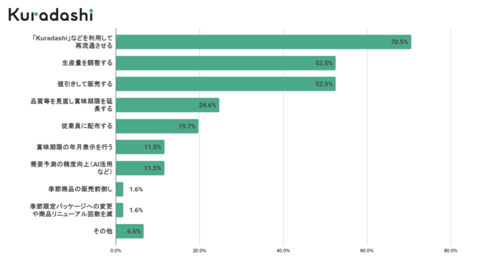 「Kuradashi」などを利用した再流通に取り組む企業が70.5%に達し、2024年調査から13.08ポイント増加しました。また、「生産量の調整」や「値引き販売」は依然として約52.5%の企業が実施しており、主要な取り組みの手段となっています。