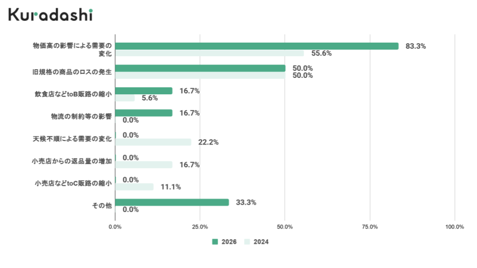 「物価高騰の影響による需要の変化」回答が最も多く83.3%で、2024年調査時点よりも+27.8ポイント増加しました。また、2024年時点では0%だった「物流の制約等の影響」が今回の調査では16.7%占めており、少子高齢化による労働力不足やドライバーの長時間労働の制限による配送コストの上昇が深刻化していることが伺えるとともに、食品事業者のフードロス発生量に影響を及ぼしていることが分かります。