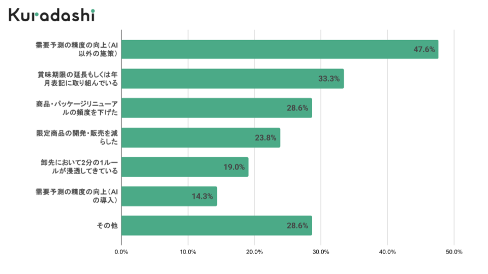 最も多くの回答が集まった要因は、「需要予測の精度の向上(AI以外の施策)」(47.62%)でした。2024年調査と比較すると、「限定商品の削減」や「リニューアル頻度の抑制」が約14ポイント増加しており、ラベル変更のみで対応できるよう商品を設計するなど、フードロスを発生させない抜本的な工夫が進んでいるように見受けられます。
