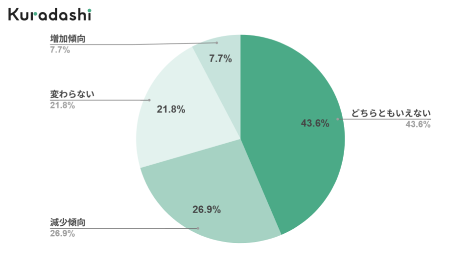 約4割の食品事業者が「どちらともいえない」と回答しており、物価高や原料高騰がフードロスに与える影響は企業ごとに差があり、十分に把握できていない実態がうかがえます。一方で「減少傾向」が「増加傾向」を大きく上回り、コスト上昇を背景に在庫管理や廃棄削減の取り組みが進んでいることが考えられます。