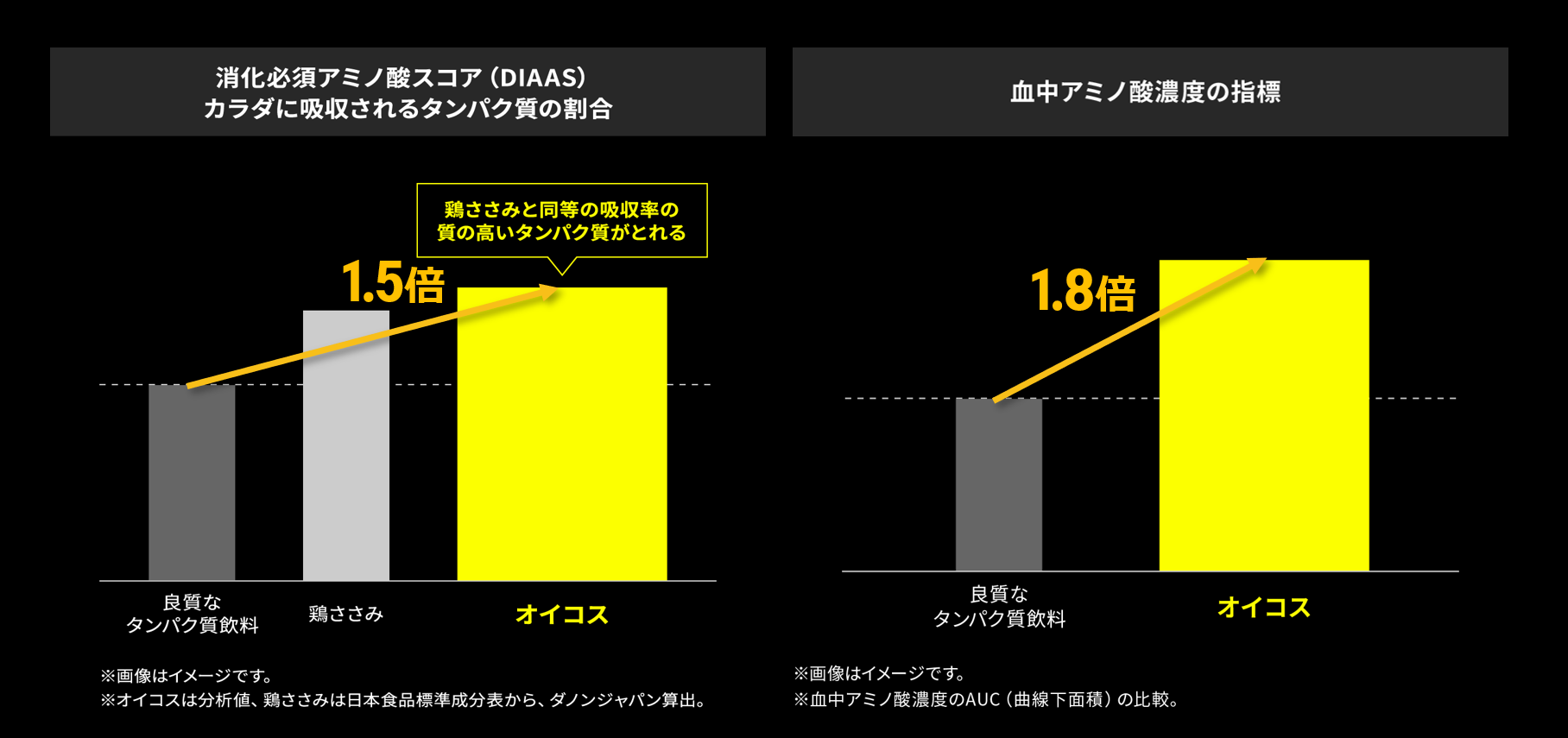 筋肉や骨など、体づくりに欠かせないタンパク質摂取においては、“量”のみならず、“質”が重要と言われています。オイコスが掲げる「高吸収タンパク質」とは、体へ吸収・利用される割合が高く、筋肉合成などに有効活用されやすい良質なタンパク質のことです。オイコスに配合されているタンパク質が身体に吸収・利用される割合は、茹でた鶏ささみ肉に匹敵する数値(※2)となっており、高い割合で血中に吸収されることが分かっています。(詳細はこちら)