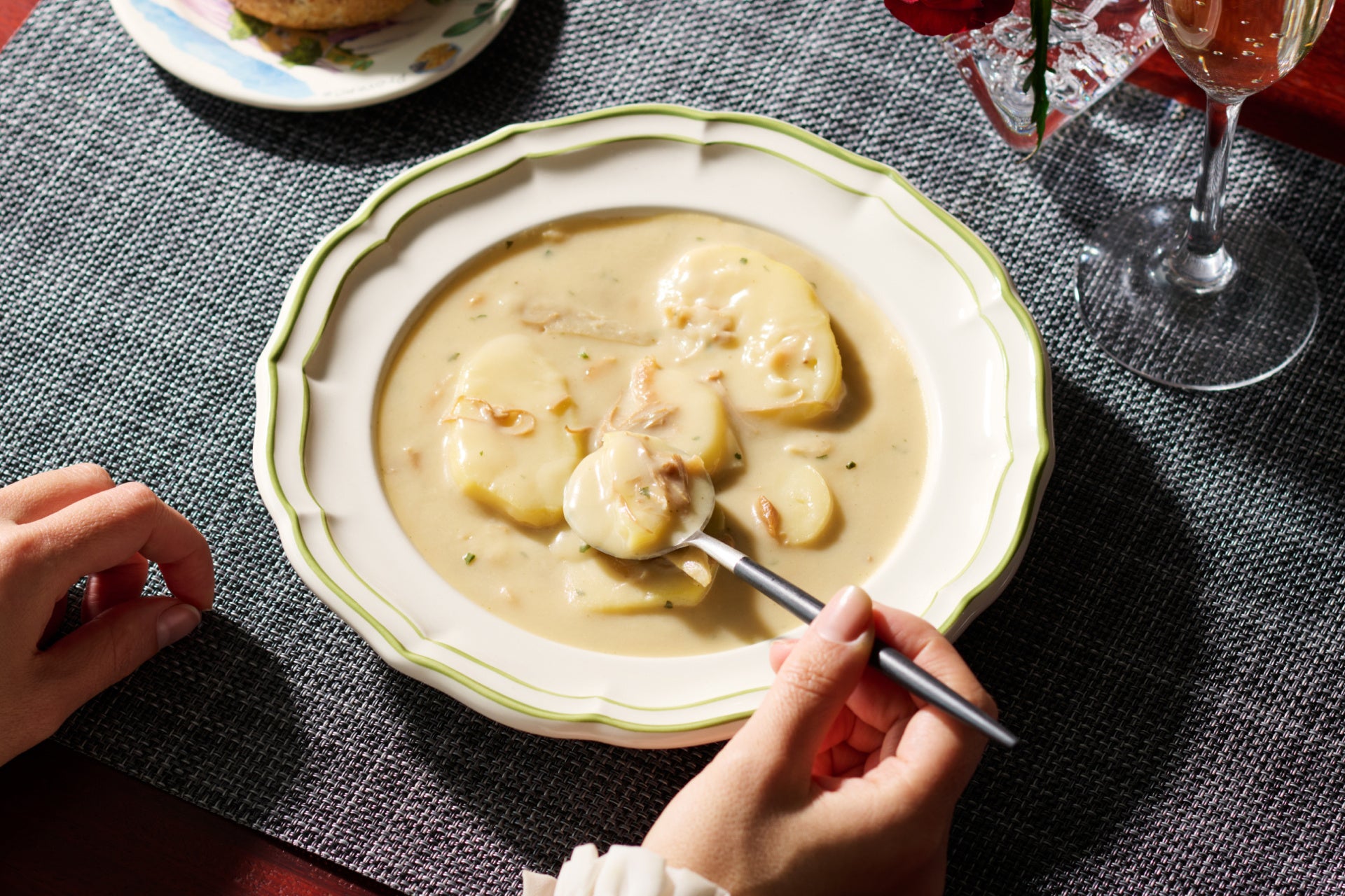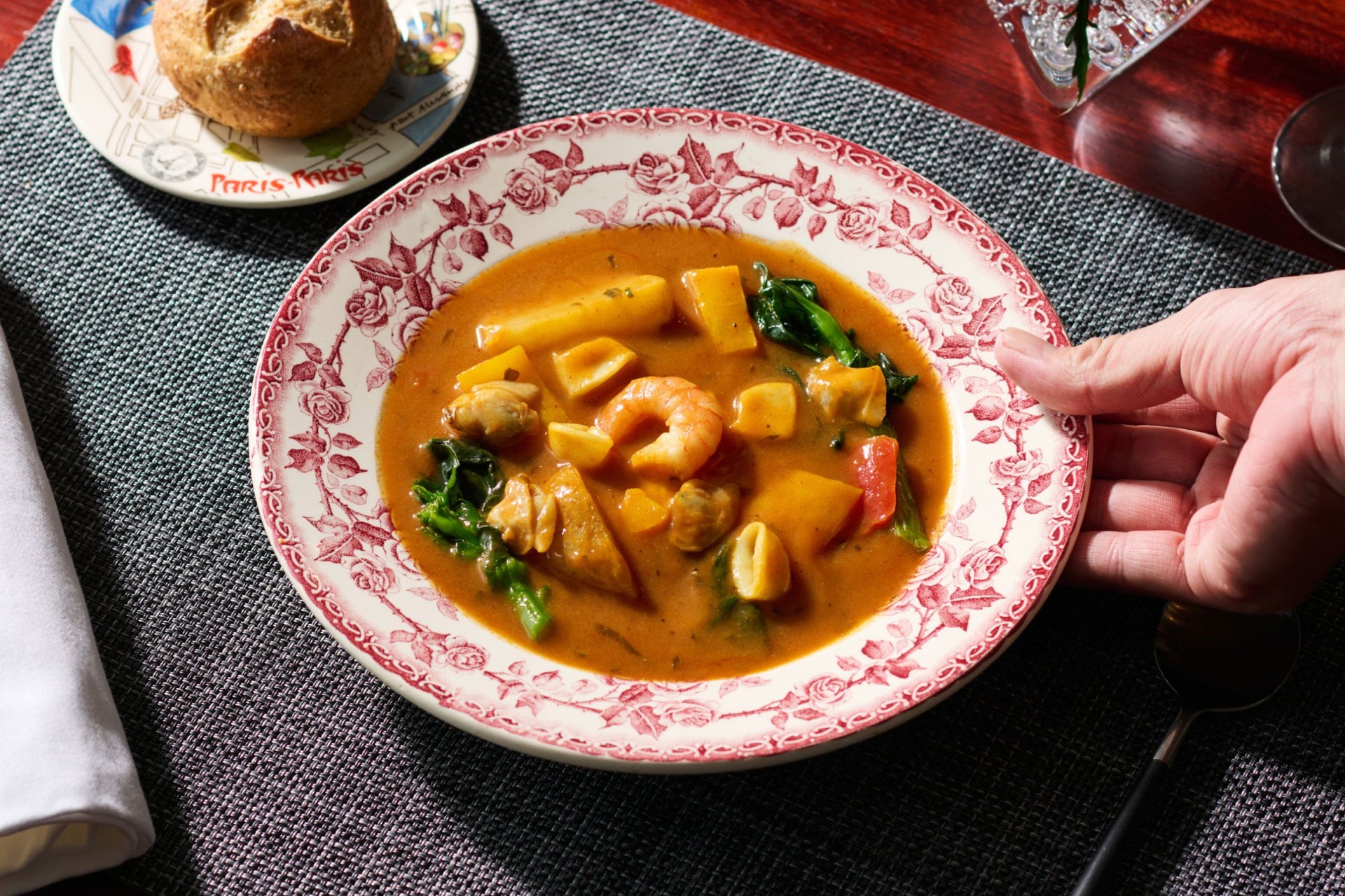 濃厚なスープは、ぜひパンと合わせて。スープをひと口、パンをひと口。