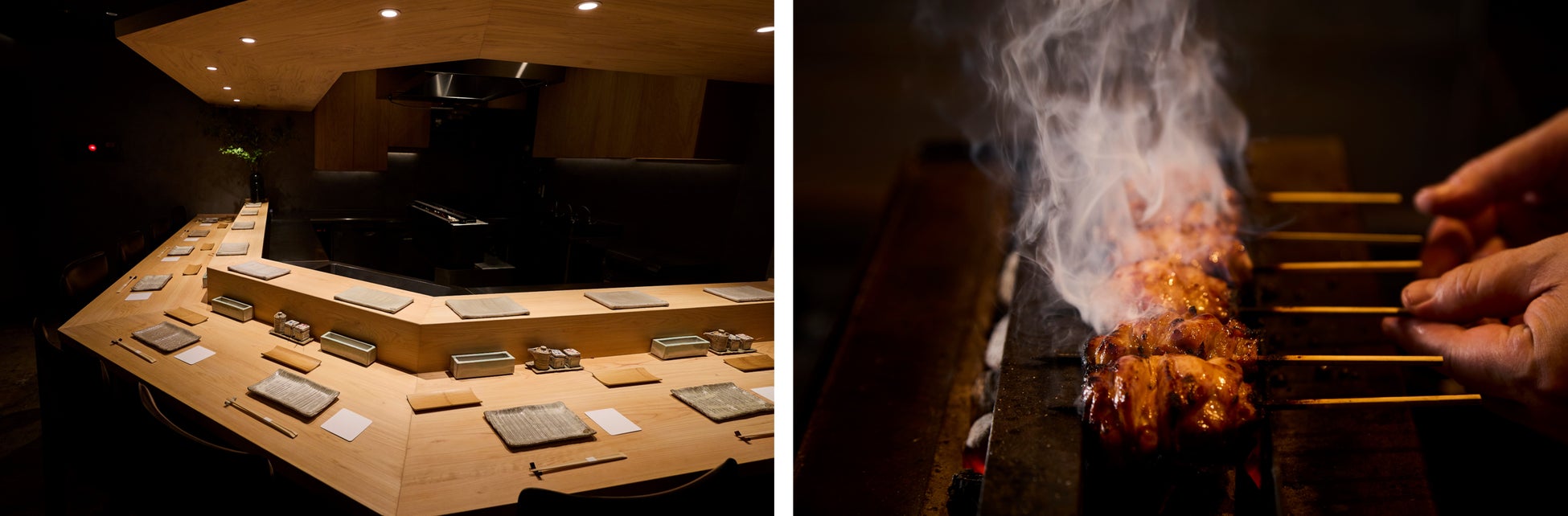 鳥しき直伝の「近火の強火」で焼き上げる焼鳥には、炭火が立てる繊細な音、香ばしく立ちのぼる煙、そして次の一本を“選ぶ”ワクワク感を添えて──