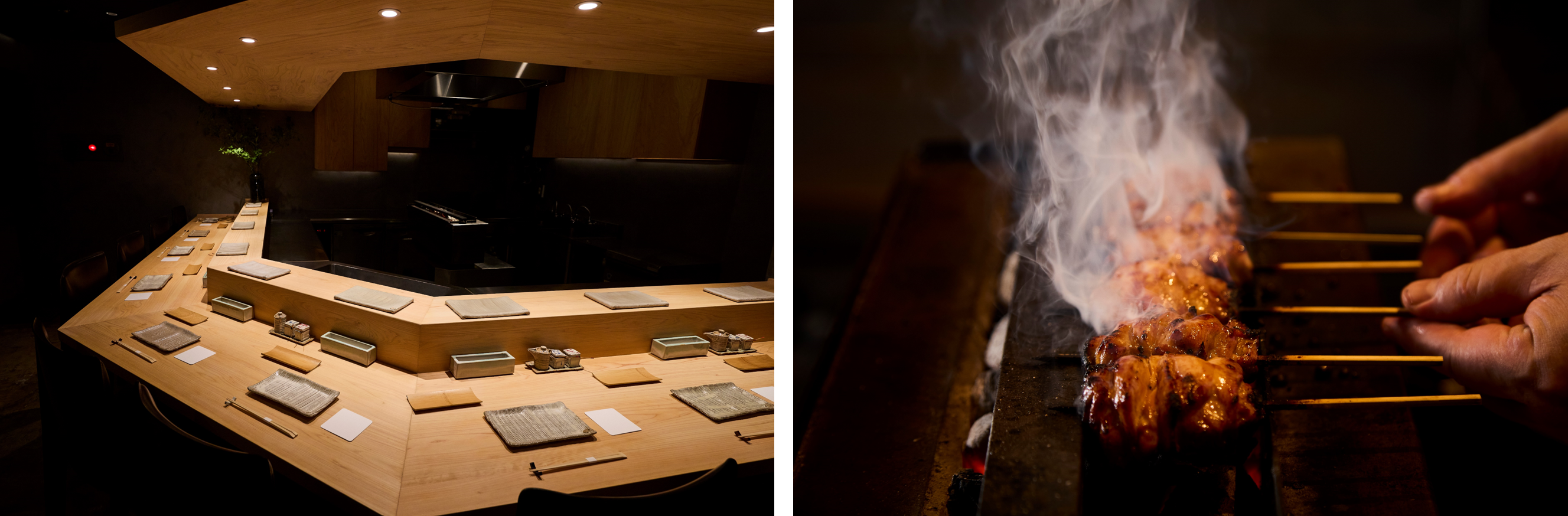 鳥しき直伝の「近火の強火」で焼き上げる焼鳥には、炭火が立てる繊細な音、香ばしく立ちのぼる煙、そして次の一本を“選ぶ”ワクワク感を添えて──